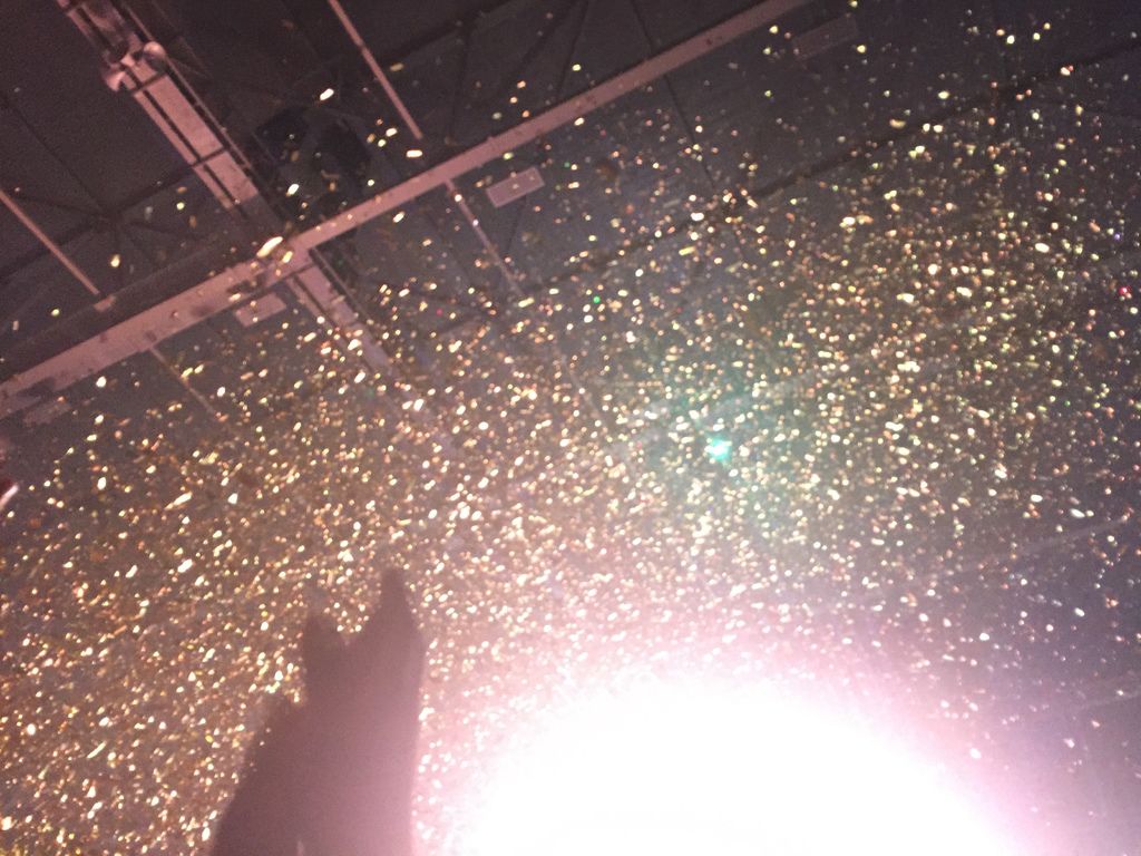 最後安可前唱經典神曲Just the Way You Are時,現場噴射出了金色的短短彩帶花~~~大家頭髮、身上都卡了一堆這小東西XD
