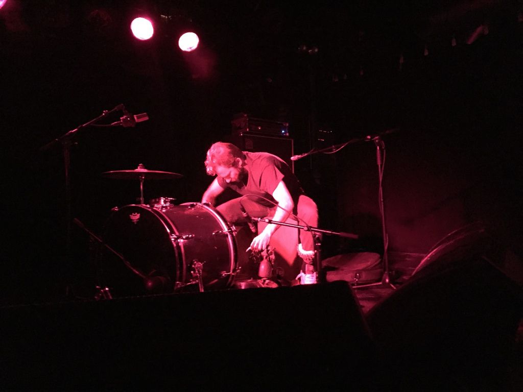 但這團不僅從頭到尾沒介紹自己名字,只在結束時說「好的讓我們一起期待等下Cigarettes After Sex的演出!」,就連音樂風格也是非常特別。在我聽來很像實驗性質的音樂,兩位樂手一個操作控台,一個如上圖般敲擊各種打擊樂器。從基本的大鼓、鈸,到很多奇怪的東西紛紛出籠。打擊樂手好幾度將手上一大串像佛珠的東西,在地上凹凸不平的盤中滑動、製造叮叮咚咚聲響,看起來彷彿在作法。而且仔細一看,地上真的擺滿鍋碗瓢盆,腳上也串著鈴鐺,只見他利用全身上下演奏。樂手投入的神情在紅色舞台光照耀下,很像憋氣憋到快斷氣