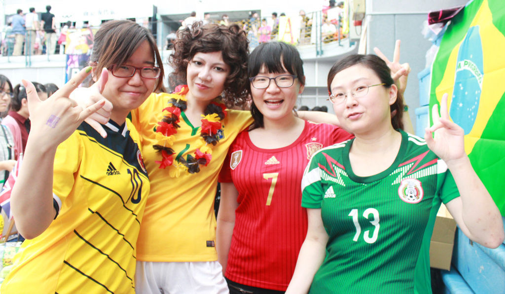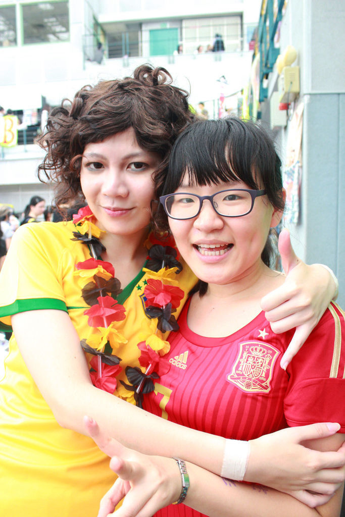 四年不見了耶,小鏡根本沒變啊一樣瘦又正,而且也一樣熱情!握手握超大力哈哈(blush) 今天她走爆炸頭打逼路線,穿巴西主場啦好顯眼!攤位上也超瘋癲的,插滿小國旗、掛巴西、德足大國旗,還有一堆五彩繽紛的本子、食物,根本遊學諮詢中心無誤XDDDDDDD