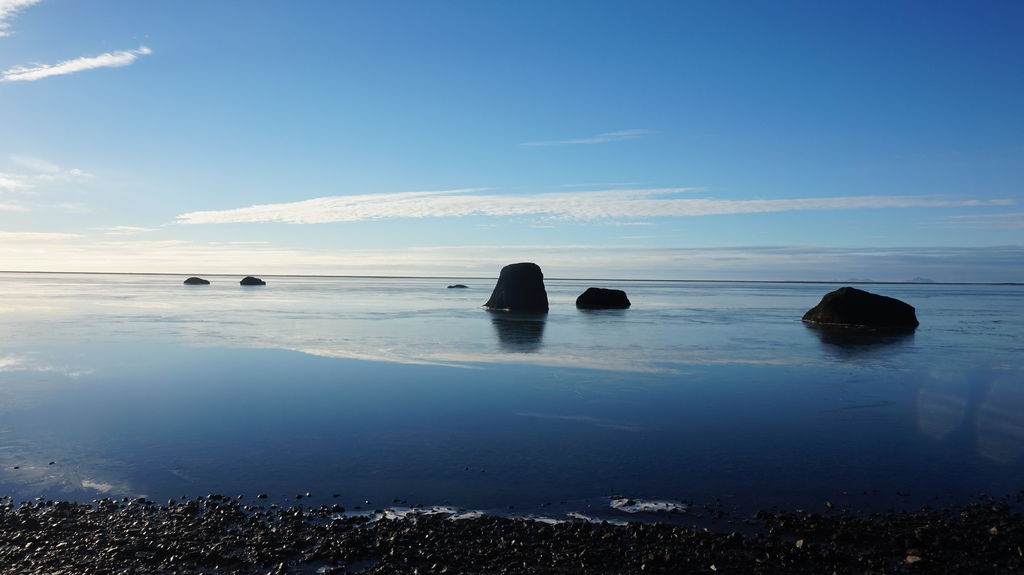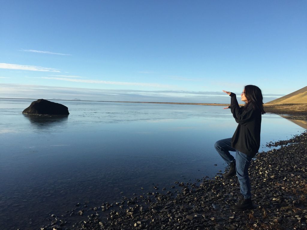 冰島這個季節的許多水面,表面都已經稍微結冰,或是因低溫而較平時凝滯,但在薄冰之下又是隱約汩動的水流。於是,這便形成了一種獨特的生命力,像是把漣漪萬物的倒影,都安然凝結於水面上似的。