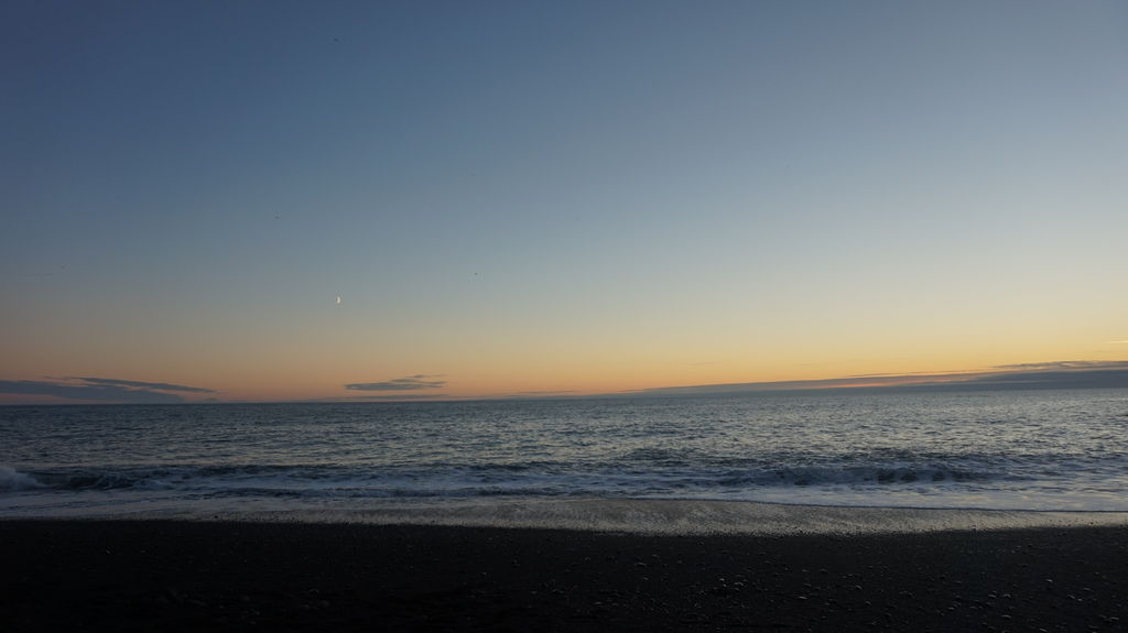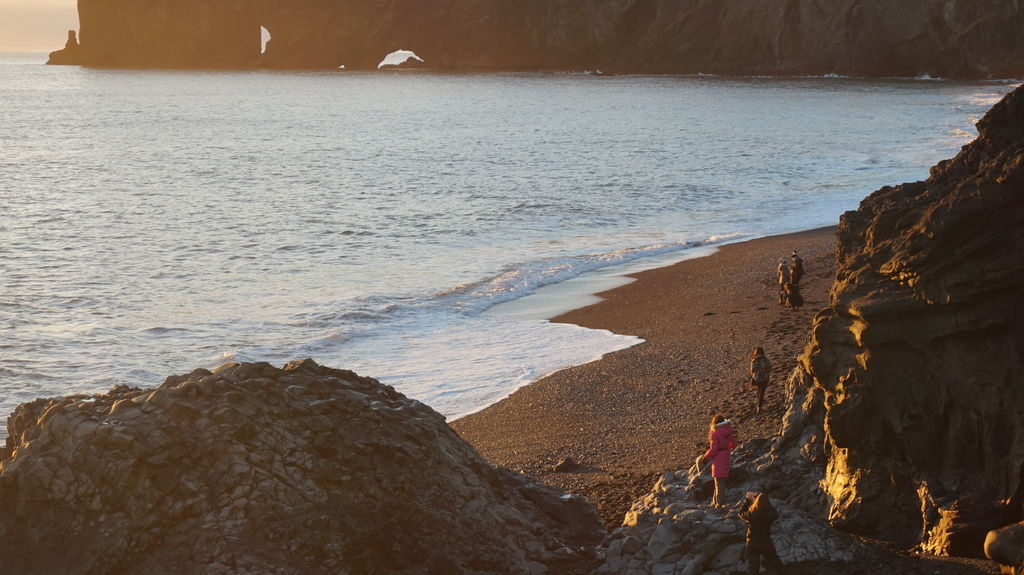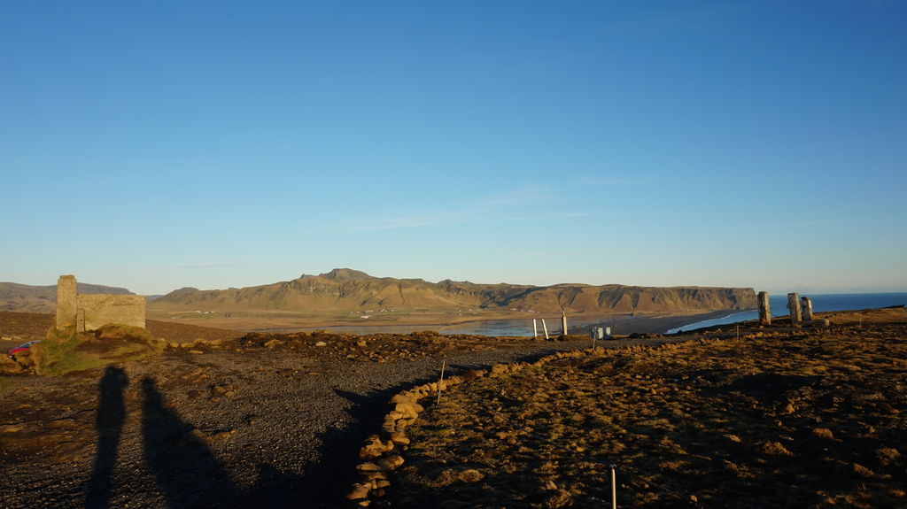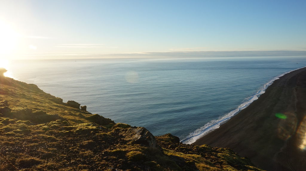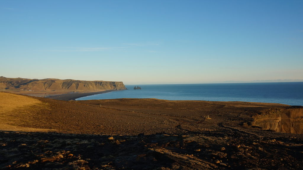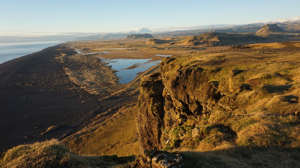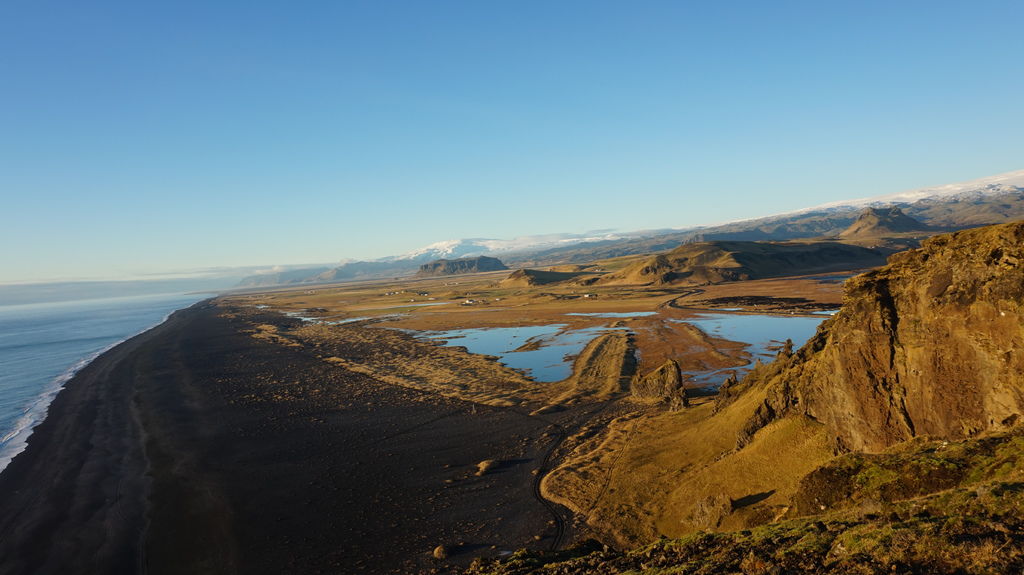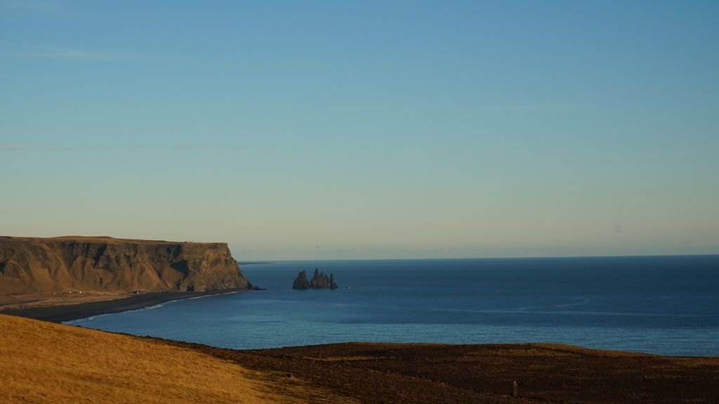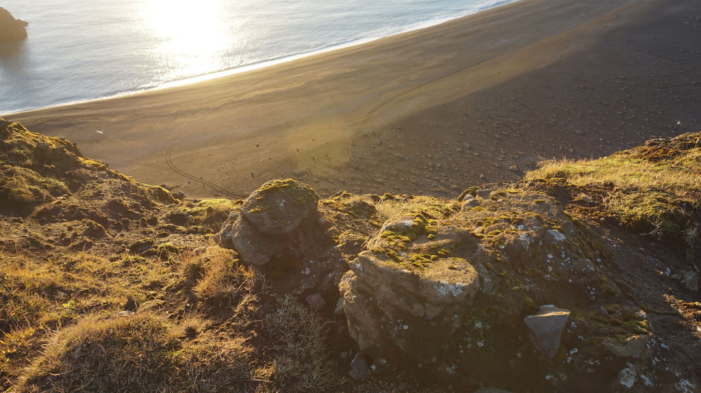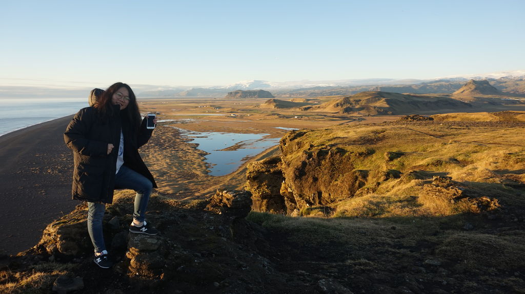 親身站在這處制高點,遠方雪山、近處墨綠卻又被陽光照耀成金黃色的丘壑、與其間蔚藍如鏡面的大小湖泊,通通飽覽無遺。而與它們有所接壤的,就是冰島南岸Vik附近有名的整片黑沙灘。整片沙灘毫無人煙,黑得樸實又沉穩。一旁的海浪來得極靜且淡,緩緩地一波波打上。於是世界彷彿因這片壯闊美景而靜止,只有偶然劃過這片風景的海鷗提醒著我,這不是夢境。