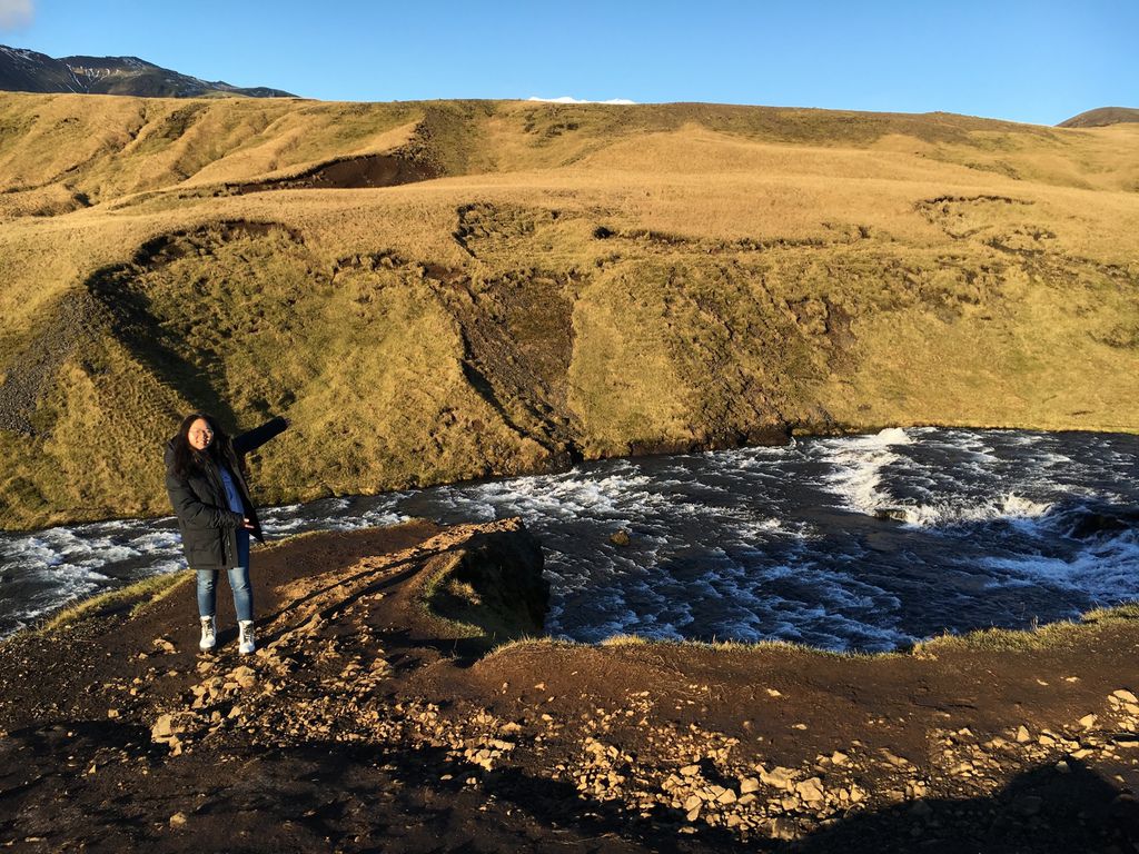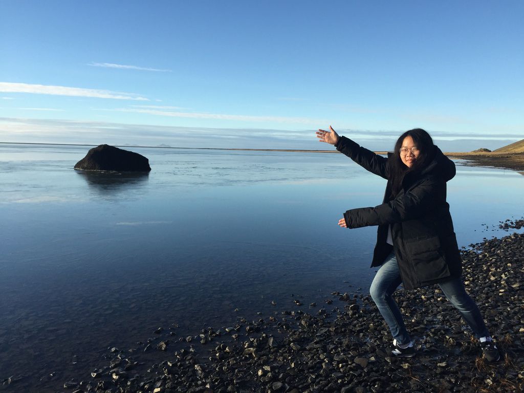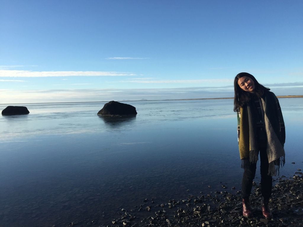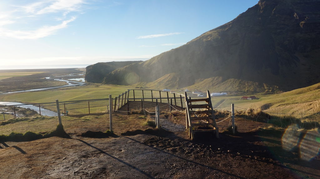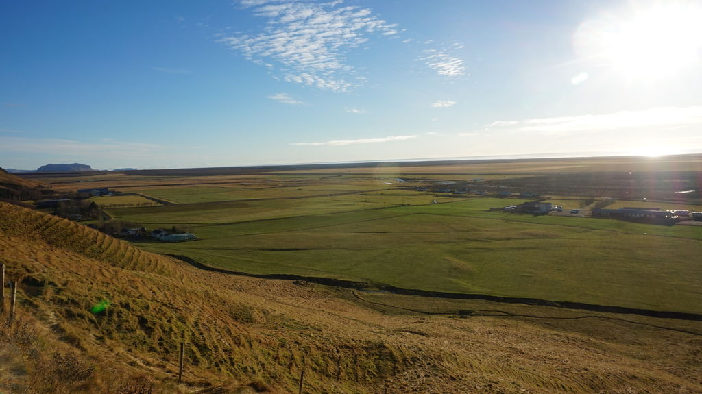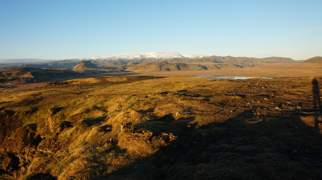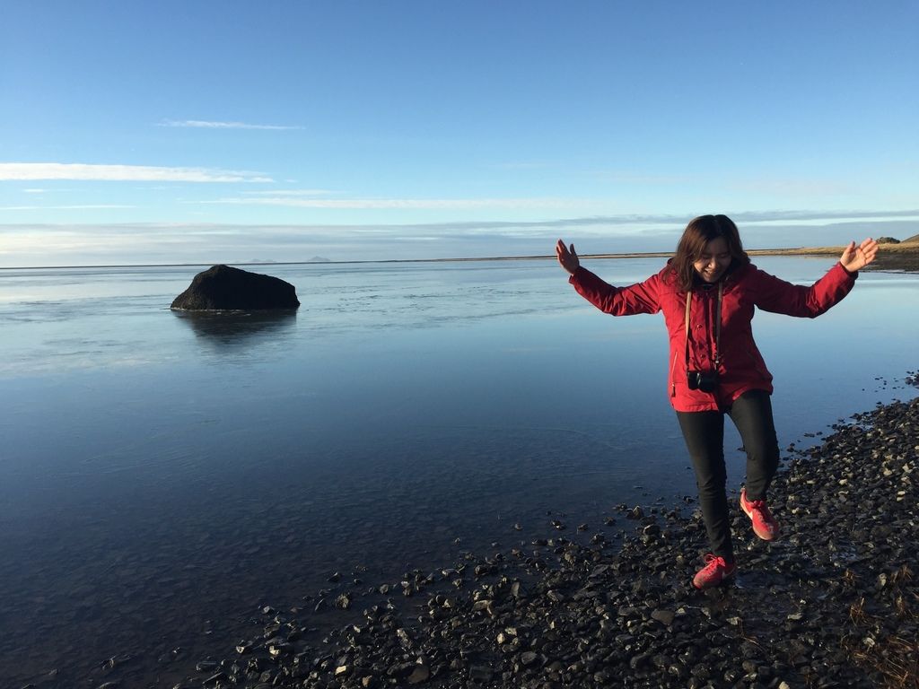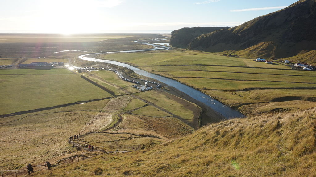 親身站在這處制高點,遠方雪山、近處墨綠卻又被陽光照耀成金黃色的丘壑、與其間蔚藍如鏡面的大小湖泊,通通飽覽無遺。而與它們有所接壤的,就是冰島南岸Vik附近有名的整片黑沙灘。整片沙灘毫無人煙,黑得樸實又沉穩。一旁的海浪來得極靜且淡,緩緩地一波波打上。於是世界彷彿因這片壯闊美景而靜止,只有偶然劃過這片風景的海鷗提醒著我,這不是夢境。