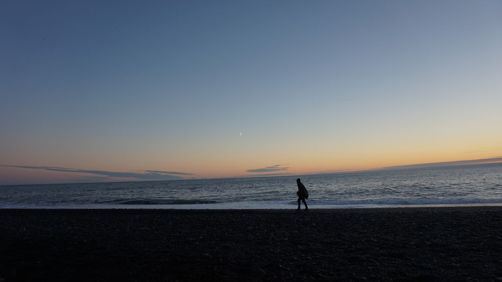 此時的沙灘,被夕陽的粉彩色調完全壟罩,天空中還掛著一彎小小的白色月牙,此情此景的美好與夢幻真的只有親身造訪才能體會得到啊
