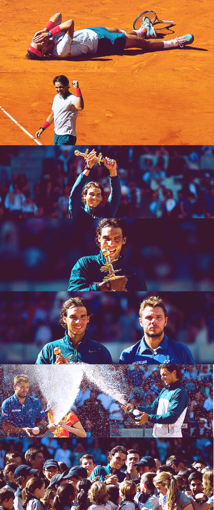 比賽到後來,Wawrinka一反前幾場拚戰到底的精神,越打越沒勁,第九局被破發。最後的最後,在目睹Wawrinka的一個回擊出界中,Rafa瞇起眼睛,笑著興奮著大吼著,倒在紅土中——贏啦!!!!!6-2, 6-4,Rafa拿下了生涯第55座冠軍、第23座名人賽系列冠軍、本季復出後第5冠———Rafael Nadal~~~(哭著灑花) 看著他燦爛無比的笑容,就覺得這整個禮拜是如此滿足。我覺得Rafa透過了這次的Madrid,真正的說服我(可見我之前多擔心XD)他的狀態已經全面回升,且還在持續進步中。嘿!至少我在周一所期盼的場景,實現了一個,而且是a big one,哈哈。