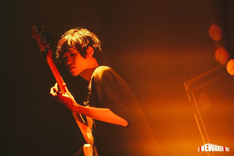他身版瘦削,頂著微捲的頭髮,在舞台後方自在地彈奏貝斯,看起來超像青春高中生呀!!!(甚至沒穿鞋,超級放鬆