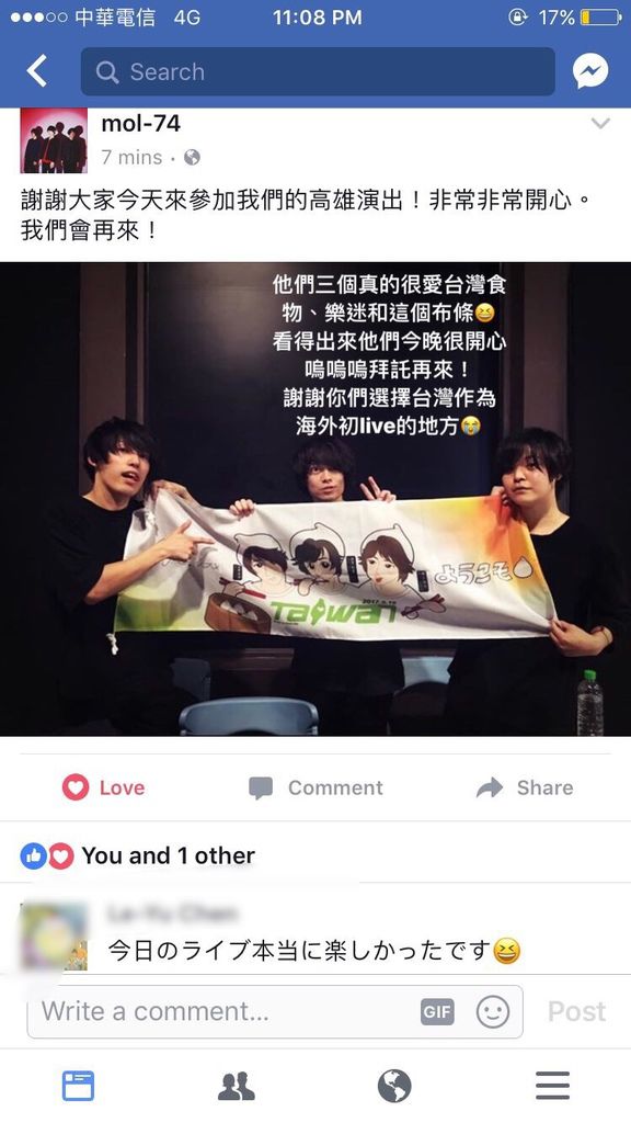 當然我也刷了mol-74的動態,facebook和instagram都是他們用繁體中文寫的滿滿感謝,還有凜桑特製的小籠包應援布條XDDD