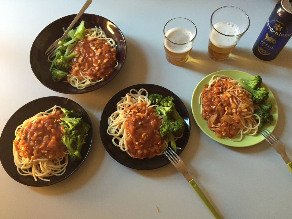 我們便一起準備晚餐、邊研究食譜和聊天。時間過得好快,在天光雲影徘徊中,奧斯陸的太陽仍沒有下沉的意思,晚餐就煮好啦!