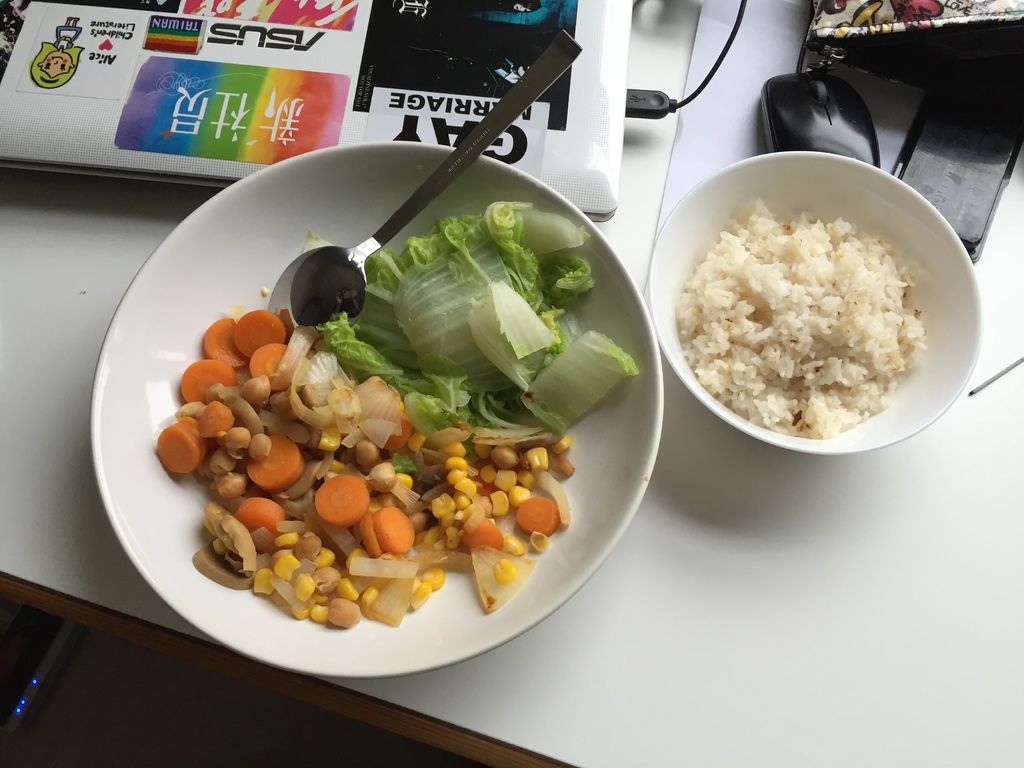 今天吃乾煸四季豆、鷹嘴豆泥、燙白菜和香噴噴的台灣式白飯 (學姊自己也多拿一顆皮蛋下飯哈哈)