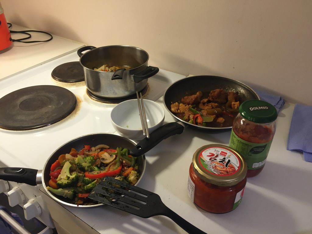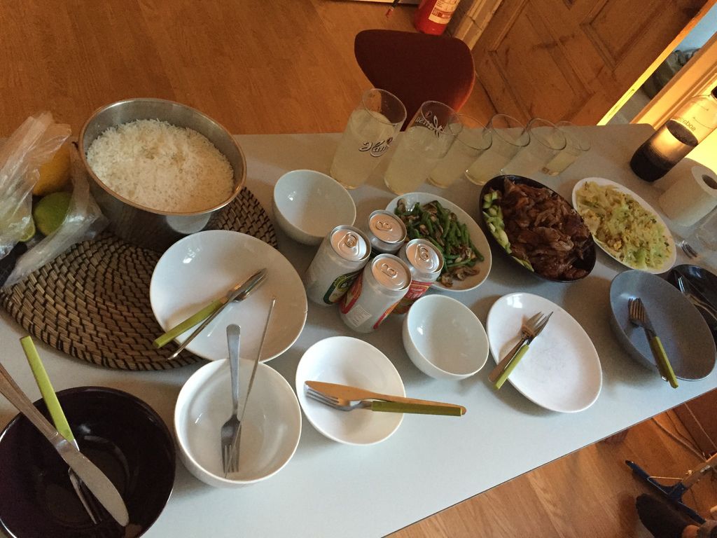 後來,我們煮了一大鍋飯、炒了四季豆香菇、高麗菜蛋,配上香香從英國遠帶回來烤雞和珍貴台啤,開始了我們溫馨歡騰的party!