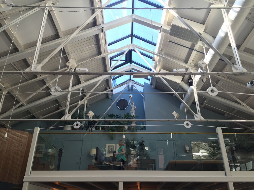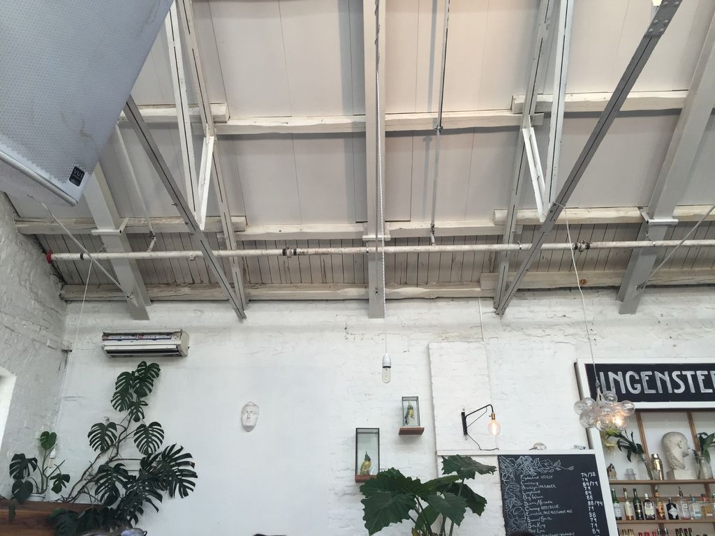 挑高的屋頂、充滿工業風的白色油漆與木頭材質裝潢,讓內部風格簡約又優雅。大大的窗戶讓採光良好,更顯裡面空間寬敞,牆側還有吧檯。感覺適合拿來擺攤、布置成餐廳,或成為舞池!因為仔細一看,頭頂有顆disco ball啊哈哈。