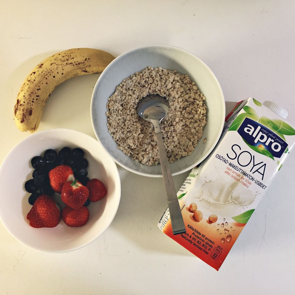 我在奧斯陸的典型早餐: 燕麥配豆奶和水果。