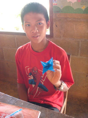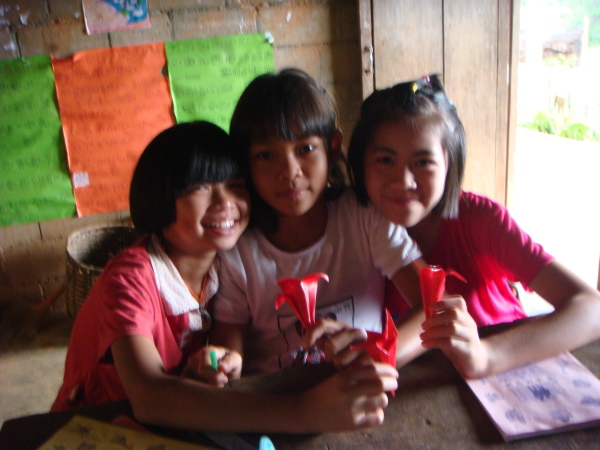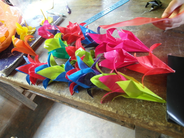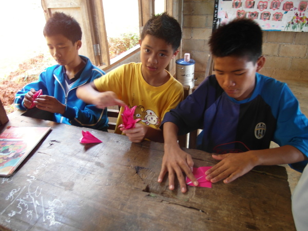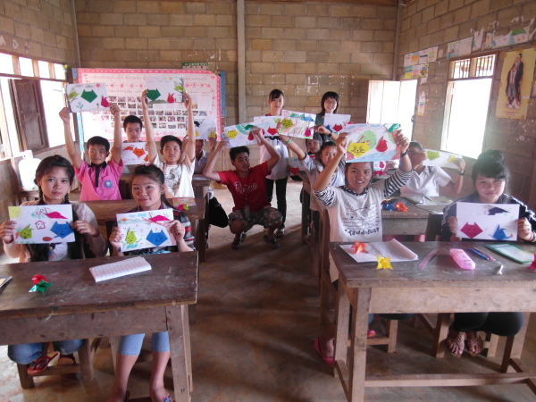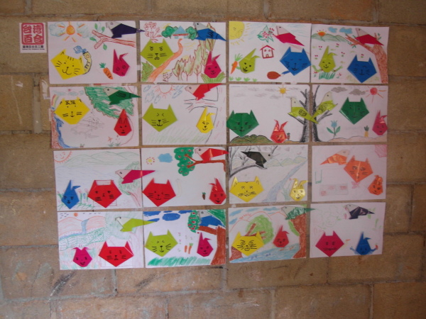 因為昨天下午都仔細安排好課程了,所以今天上起課來也比較從容些XD 第一堂課大家決定要教孩子們摺百合花!沒錯,那些百合花正象徵著百合志工團在這裡的時光以及我們的精神,成品也正好可以拿來布置教室。而且,也絲毫不意外的,小朋友們還是摺得比哭哭們好太多了,哈哈哈!之後,宥甄和我就請小黑幫全班和我們的百合花、前天創作的摺紙圖合照。小黑還很用心的讓每個孩子站在牆前,拿著自己的作品拍個人照喔。(因為我們班人少咩~哈哈)最後,教室的牆上就貼滿了大家可愛的畫作,左上角還有百合志工團的logo,希望他們看到這面牆,多少會回想起我們曾在這裡與他們一同生活的點點滴滴。