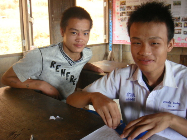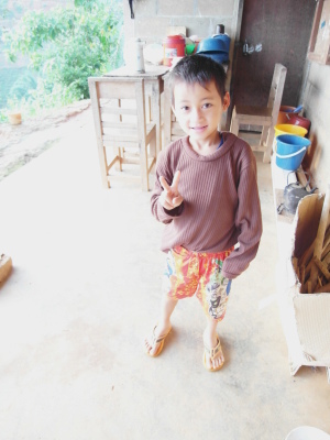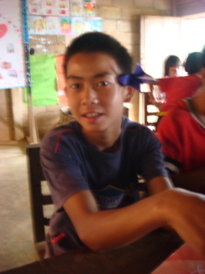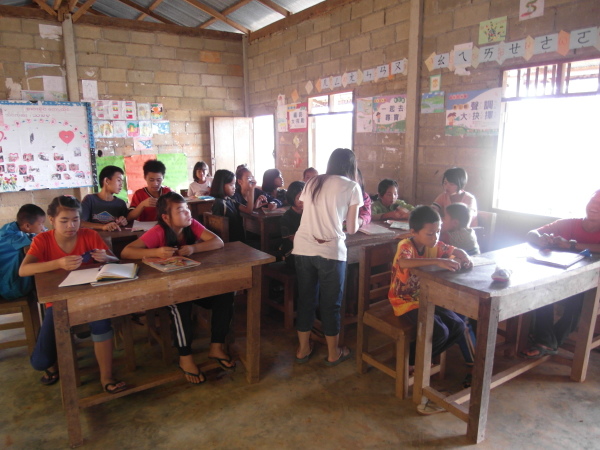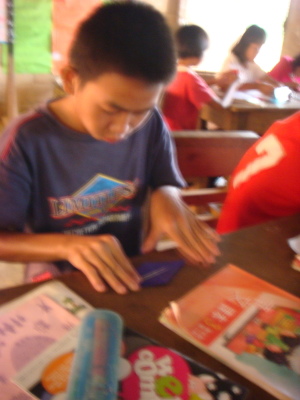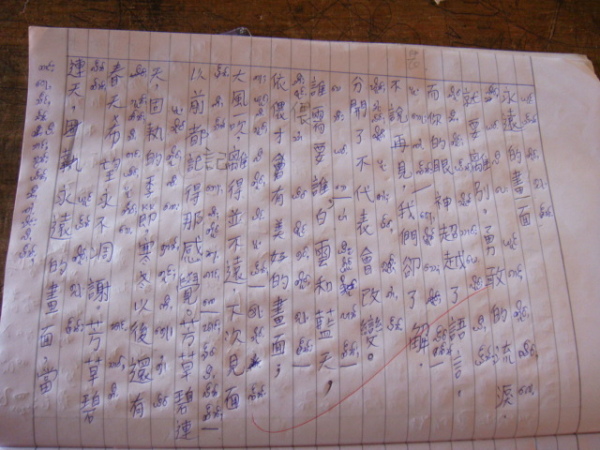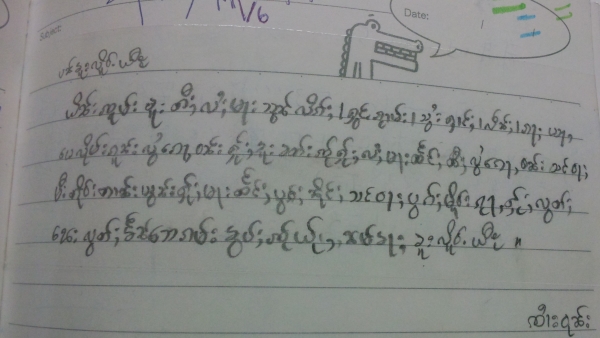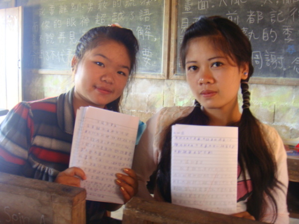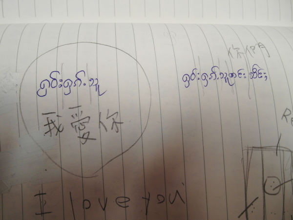 家恩聽了,就在河流裡(沒錯,因為他紙上沒空間了XD)寫下「老師謝謝」四個字,好乖喔XD 而因為我實在太私心我的愛徒英強(笑),就拿了日記本翻了一面和他說可以寫寫想和我說的任何話,可以寫傣文沒問題的。想說我陪他晚自習了幾天,白天又帶三年級,他應該不至於會詞窮吧XD 結果——哇啊,英強超認真地在寫給我的留言耶!頭低低的,筆握得很緊,還不時停頓思考下一句要寫些什麼,下課鈴聲都響了他仍是坐在位子上寫著寫著。其實我光看到這情景就覺得窩心了……最後,英強居然寫了四行多密密麻麻的文字!看到他又露出萊果旺小孩招牌的靦腆笑容,把本子還給我,並告訴我不要叫他翻,去找美麗老師幫忙翻譯時,當下心裡真是無限感動,好想永遠記住他現在這樣認真可愛又努力的模樣啊。