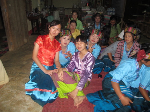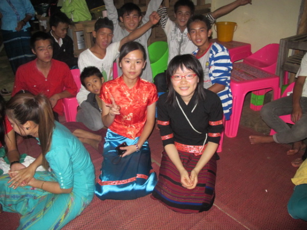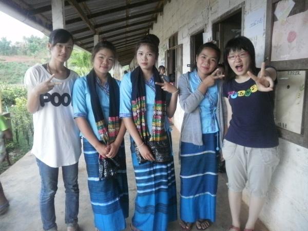 又更晚後,越來越多小朋友們也都來了!好多人是盛裝打扮地從家裡來到學校,看來是等下有表演要show給我們看,我們班的女孩們穿上傣族傳統服飾真是美麗啊~在各種讚嘆聲與相機快門聲之後,我們忽然意識到自己正被女孩們推著走,「老師,來,這邊這邊~」呃,哪邊啊……欸?!原來我們也要換上傳統服裝嗎?真的假的,好妙的體驗喔!(驚)女孩們一路領著我們,到另一個女生宿舍更衣,那裡居然有個小倉庫專門存放著滿滿的傣族服飾耶。待她們將一件件裝束拿出來後,我才看到原來每件都不同,感覺很像戲劇用服裝。(笑)有些長得有點像台灣原住民服飾、有些則帶有清初時期衣服的風格,最爆笑的是……芋頭她居然被分配到一件無袖的粉色上衣!哈哈哈,她簡直快崩潰了!!!XD 要她穿無袖簡直是直戳她死穴啊!雖然女孩們一直跟我們說「老師,穿這樣漂亮。」、「老師,美麗!」,但我們幾個畢竟還是穿不習慣這樣的衣服,怎麼穿都覺得好彆扭啊!但為了秉持入境隨俗的良好精神,並配合晚會氣氛,我們都還是乖乖讓女孩們幫我們處理所有拉衣服、綁腰帶、整理裙子等等的繁雜手續。可憐的芋頭,似乎抵死不從也無法逃避穿無袖的命運;所幸後來,在她苦苦哀求(?)下,孩子們才發現哭芋頭是絕對無法穿著無袖傣族服裝踏出這棟宿舍的(也太誇張XD),便也很爽快地幫她拿了另一件看起來有點中國風的淺粉服裝。哭芋頭此時表示自己終於被赦免了,感動非常XD 哈哈,看了看大家,我們都穿著自己這輩子大概也沒機會穿第二遍的服裝,有點怪異有點不習慣,但又覺得十分新奇有趣。蔡家姊妹檔、芋頭和宥甄的衣服都讓我想到中國鄉土劇,姐姐的衣服超美麗啊根本是泰航空姐~我自己的,是穿起來很熱的長袖墊肩黑衣,裙子上的花紋有種原住民風的美感,雖然不難看,但這塊綁成裙子的布實在好重好寬鬆啊!之後下去會場時,還得請班上女孩們幫我調整、拉緊腰帶兩次,才避免了掉裙曝光的危機(汗)。吼~穿上這種窄長裙,我都不會走路了啦!更別提還要在這種裙子疑似隨時都會滑落的情況下,跳〈豬之歌〉啊~~~(慌)