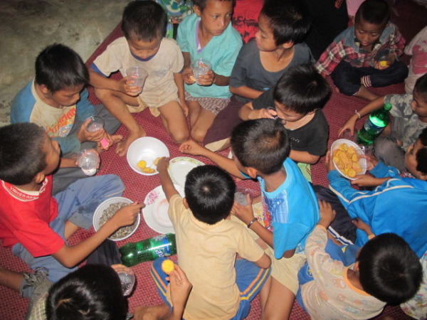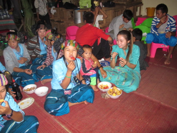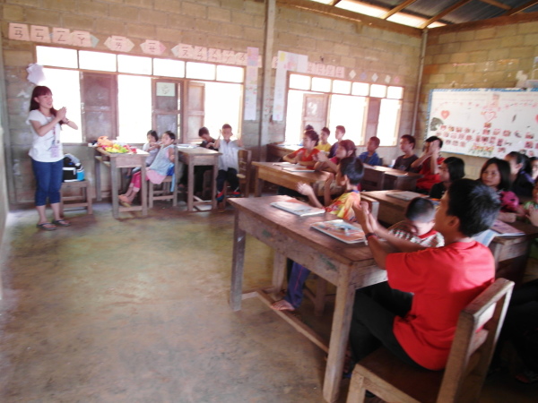 晚會即將開始,當我們一行人穿著傳統服飾踏入活動中心時,早在裡頭集合完畢的孩子們就開始起鬨似的「哦~」、「哇~」了,哈哈哈。活動中心裡的地上鋪了塊大地墊,孩子們就列隊坐在上頭。萊果旺老師們忙著分送飲料、水果、瓜子餅乾零嘴等等的東西到我們眼前的桌上,接著再端給小朋友們吃,大家都好像開同樂會似地開心。前方預留了一塊場地讓我們進行表演,旁邊一點則是一些音響設備和筆電等等,準備待會播音樂用。從很多小地方都能感覺得到,萊果旺對於我們這些異鄉人是竭誠歡迎的。「你們就是台灣的傣族人!」萊果旺的校長這麼說著,聽了真是覺得感動又窩心,這是一句多麼溫暖且友善的話,我的世界彷彿也因此再無任何界限或隔閡。