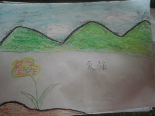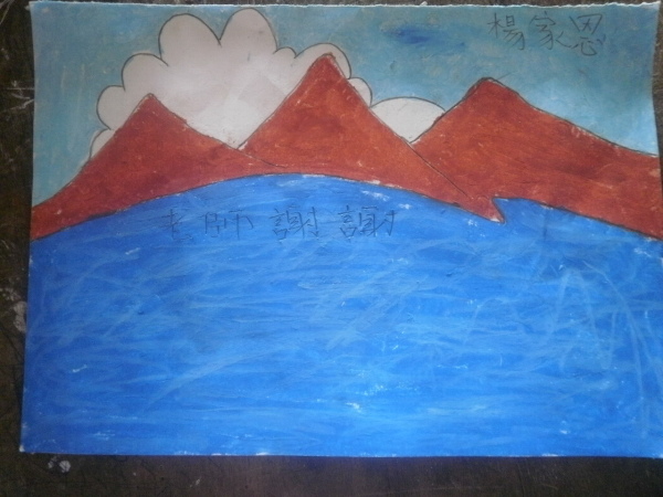 畫畫過程中,我偶爾也會走過去看看孩子們的進度,女生們都害羞地把圖畫遮起來,但即使如此,她們先前仔細的著色動作就足以讓我明白她們的用心。而男生們咧~哈哈,不意外啦,每一個看到我來都像看到鬼(喂),趕忙把圖畫紙往抽屜裡塞、搞神祕偷笑,又不時配上無敵靦腆又可愛的傻笑想要裝沒事。哈哈哈,我是覺得沒差啦,不想干涉孩子們的繪畫創意,不過是有必要那麼緊張嗎?真是,我最後還不是會看到~(掩面笑)畫著畫著,都過了一節下課,也沒人記得要去敲鐘,所以我們算是一氣呵成!到後來,果然是女生們先交出作品,接著又陸陸續續地有些男生也靦腆地將圖畫紙遞給我。高年級孩子們的繪畫作品果然和幼幼班們大不相同,沒有那麼白癡爆笑的無厘頭,取而代之的是寫實又細膩的風格,都不用特別辨識就看得出來是我還是宥甄了!眼見還有些人沒畫完,我們就先帶畫完的孩子複習〈永遠的畫面〉,唱唱跳跳等等。殊不知……我們都唱完好幾輪了,還是有人沒畫完!(大驚)英強和家恩!都要下課了耶兩位先生——咦?看你們面有難色,是有什麼苦衷或遇到瓶頸了嗎?來,老師聽你說~走近一看,哇咧,只見兩位男孩的圖畫紙上……都沒有「老師」的身影啊!!!直至此時,他們兩個才露出很不好意思的表情承認:「老師!我……我不會畫老師!(苦惱貌)」再仔細看看,家恩的圖畫紙上畫了河流和遠山,英強則畫了花草天空山坡地……就是沒有老師,哈哈哈哈哈哈哈!!!那他們剛才兩節課一直抬頭端詳我的樣子是在看什麼啊~也太可愛了吧!(笑翻)我又好氣又好笑地告訴他們沒關係啦,我知道你們可能不太會畫人,但也可以寫些字給我們啊。