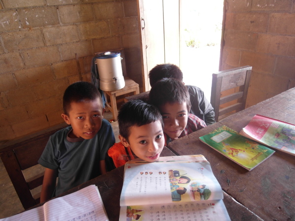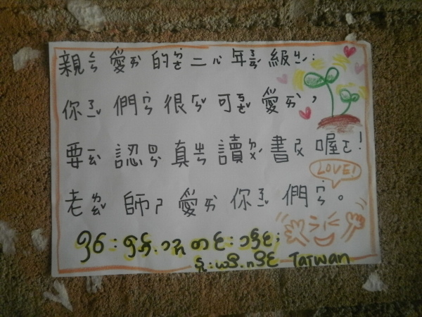 第二節課中後段,我也跑去幼幼班那邊探了個班,想說來目睹混亂的場景順便解救無助的姐姐。不出所料,一進去就看到姐一個人在前面的小桌子批改注音練習,小孩子們則是在教室裡吵吵鬧鬧、跑跑跳跳的,有點失控。但姐告訴我這還不是最失控的時候,她昨天不只被小孩子的鼻血濺到衣服,有位小弟還拿水槍進教室耍淘氣;剛才我進來前,暴力哥甚至還意圖拿她桌上的美工刀傷害孩子,這惡行也太驚悚,還好被姐遏止了!我走下去座位看看孩子們的情況,隨機問問他們ㄅㄆㄇ的念法,大部分的小孩本來都嘰嘰喳喳,看到我走近就瞬間變安靜害羞,哈哈。只有雜拉不一樣,這小孩不知道是和我們玩開了還是怎樣,看到我們幾個已經不怕生了~他這堂課也超忙,一直招手呼喚我過去教他寫字、寫我名牌上的名字,要不就是不斷弄斷筆要讓姐姐幫他削等等,根本是隻愛撒嬌又很需要spotlight的小猴子XD 另外,仔攢也是超級可愛!(大心)我問他注音符號,他就很認真地用他一貫沙啞的嗓音,認真地一個一個念給我聽,甚至也拿了我的名牌卡來研究,把我的傣文名字寫在ㄇ和ㄈ的練習紙裡面送我~老師好感動喔仔攢!前一節下課,我跑去和三年級孩子們互動時,問了他們「我愛你們」、「我想念你」的傣文怎麼說,順便問了問大家的傣文名字,請他們寫在我的名牌紙上。而這時,我也趁機請仔攢這麼做。看著他小小的手,用力地握著筆認真寫下他的名字,真是覺得心都柔軟了起來。哈哈,不過後來我拿名牌給英強看時,英強和我說仔攢把他自己的名字寫錯了啦!好像是少了一劃還是一個勾勾,哈哈這傻孩子!(大笑)