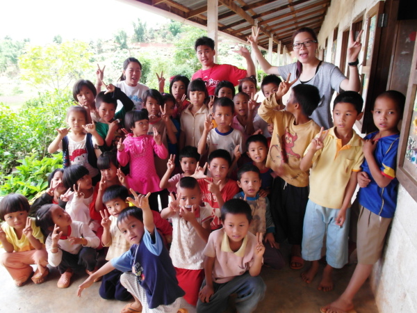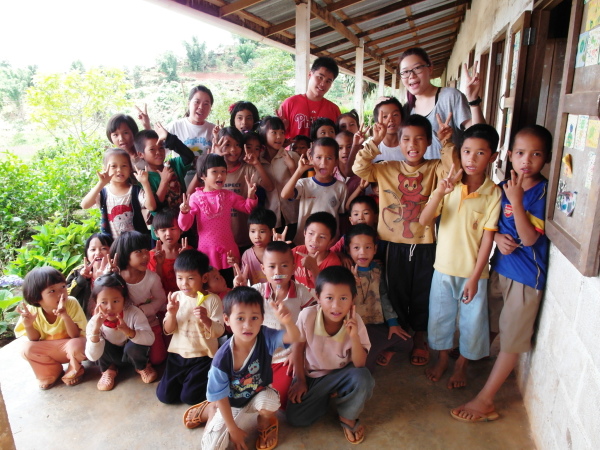 好啦,教學成果都展現完了、high也high完了,小朋友們甚至連餅乾水果都吃完了(笑),再來就是我們八位哭哭最期待也最害怕的感性時刻了!(掩面)當〈永遠的畫面〉音樂一下,我就知道待會自己一定會眼淚潰堤。先唱一小段歌,接著我們一個個上前輪流表白想對萊果旺師生說的話。我只記得,宥甄先上去說了些話,然後開始哽咽,再來,我的腦子裡就是〈永遠的畫面〉所有的歌詞與旋律,緩緩交織著來到萊果旺這五天的種種:第一天的狼狽、又晴又雨又是颳大風的天氣、小朋友們一開始的害羞怕生、每次上課又累又滿足的心情、和大家一起吃飯、打球、看過一場場精彩的足球賽、我們越走越熟悉的每條小徑、後來孩子們會主動跑來和我們玩、夜晚絢爛的星空和點點螢光……「就要離別/勇敢的流淚/而你的眼神超越了語言/走慢一點/不管有多遠/放不下就代表不會變/芳草碧連天/永遠的畫面/當我想念閉上雙眼你在心裡面」,想著、唱著,眼眶已經微熱了,抬頭發現岱君快講完他那有點搞笑、有點三八的感想,下一個就是我了。接過麥克風,我走上前,和小朋友們說了我的名字後,接著說:「嘿大家,我好喜歡萊果旺的雲和山、星星還有天空。但是我最喜歡你們……講完這句,我就開始大哭!!!剛才稍微擬定好的句子都在腦裡攪成一團,一切回憶都在瞬間湧上心頭啊,嗚嗚嗚!只有前三句是照稿演出的吧,後來就情感氾濫、想到什麼講什麼,眼淚還一度毫不受控地直流,讓我完全哽咽語塞。轉頭看看,後面宥甄和新妤好像也還在流淚,還沒發表感言的姐和芋頭要我不要哭,要繼續講下去;往前看去,好多雙純淨的眼眸正盯著我看,似乎不懂我為什麼要哭得這麼傷心呢?然後,耳際隨之傳來我們班小孩大喊「老師加油!」、「老師不要哭!」的大喊聲……吼!這樣是要我怎麼不哭啊,當然是馬上哭得更兇~~~(噴淚)其實,我真的已經忘記我當晚講的確切內容了,只知道我努力想表達的一切就是:「孩子們,你們是這麼的可愛、這麼的認真也是這麼的棒,我們真的好愛好愛你們,更捨不得你們……還有,以後我一定一定會再來的!(繼續流淚)」是的,自此之後至晚會結束,我想我的眼淚幾乎沒停過吧。後來接續的姐姐和芋頭同樣也是告白到一半就哭了,本來姐還笑著說幼幼班這麼調皮她應該哭不出來,但在最後這當下,最真實的情感總是表露無遺啊。最後的最後,我們八人齊聲向孩子們大喊了一句傣文的「我愛你們」,希望哭哭的真心和愛,小朋友們都能明白!(又哭)