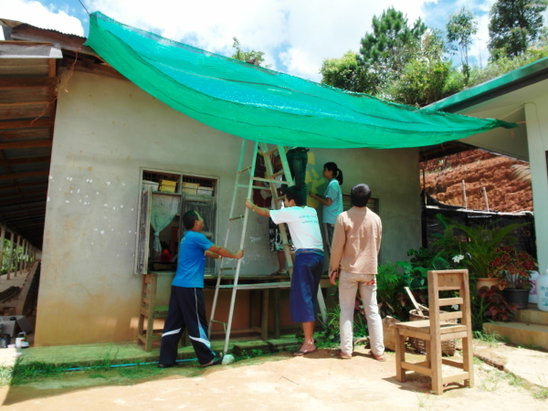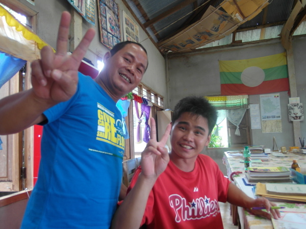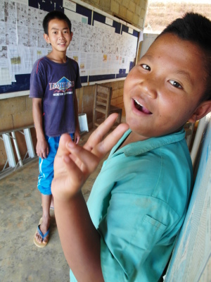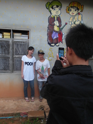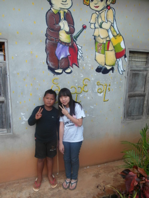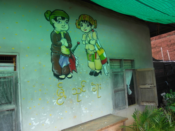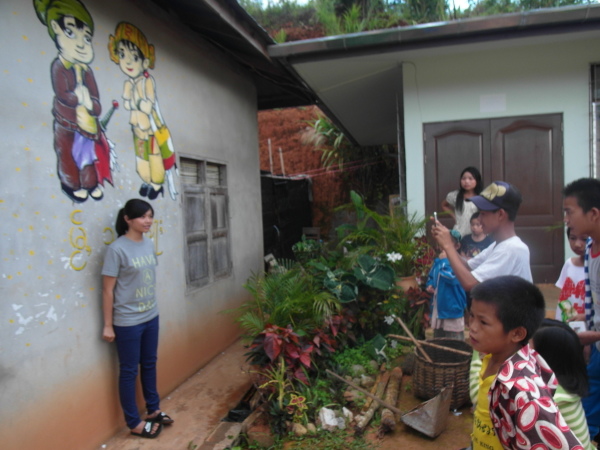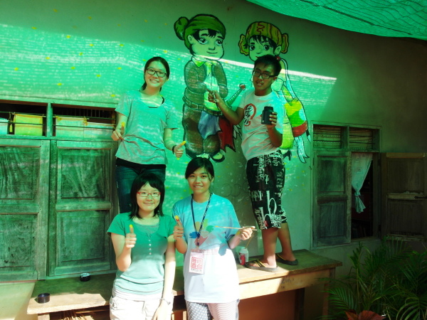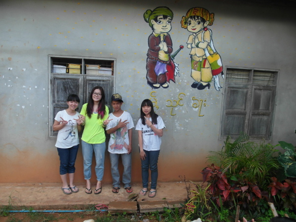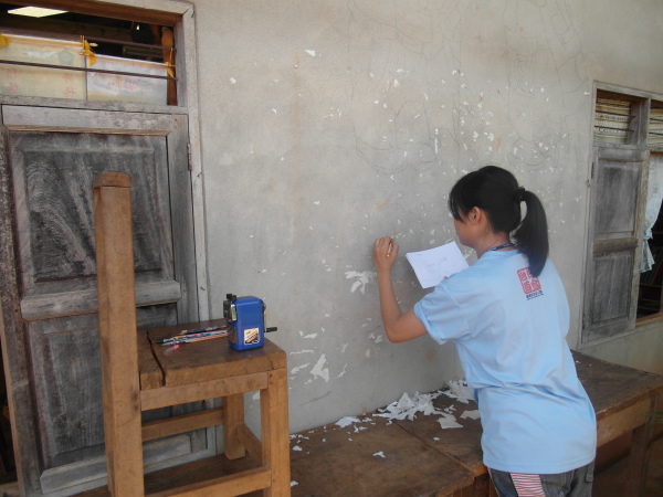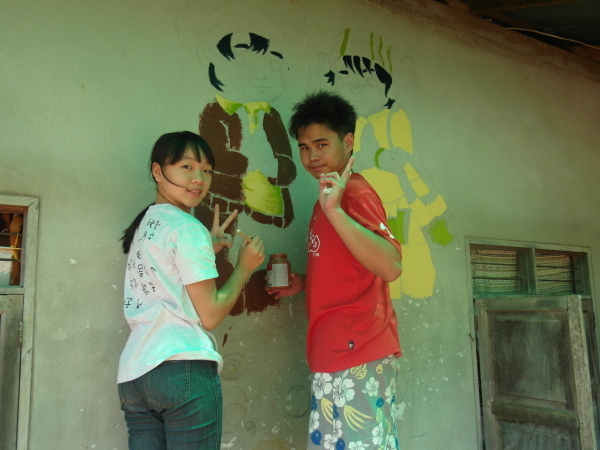 與此同時,芋頭和小黑正在外頭忙碌著,肩負著一項重責大任——萊果旺的歡迎壁畫!在校舍入口處的外牆上,他們依著紙上樣本畫出了兩個穿著傳統傣族服飾的男孩女孩,雙手合掌,底下寫著大大的傣文「你好」(ㄇㄞˇㄙㄨㄥˇㄎㄚˊ)。這兩個廣設科專才實在太棒了~每次來泰北都能藉由自己的專長為所服務的學校留下很實質的貢獻。這些壁畫會一直留著吧,成為我們曾在這裡生活過的憑據。