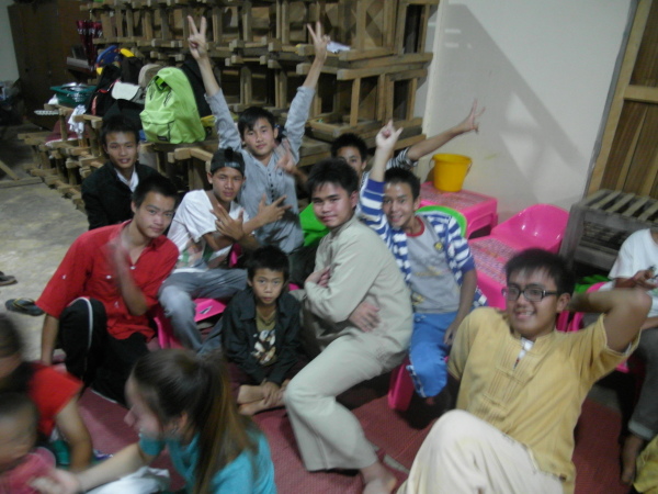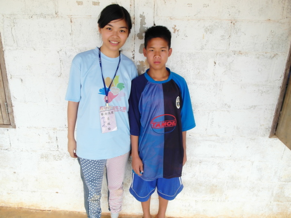 晚會結束散會後,大家紛紛在場內拉人合照、擁抱。我抱了英強、明亮、小胖和仔攢,擁抱果然是無國界的語言,將雙臂敞開,在淚水中擠出微笑,他們就明白我要討抱抱了!哈哈,不好意思,老師真的很愛哭,只希望你們都能了解,我的每一句「我愛你們」都是真心、無價且永恆的。我看到美麗老師、小胖和小蜘蛛詠靖這兩個比較感性的孩子也都哭了,他們甚至還想耍帥地別過頭去,隱藏自己的眼淚。嗚嗚,看到這幕當然是一把抓過來緊緊擁抱啊!十點多後,人潮漸散,一聲聲的「明天見」似乎也都染上了不捨的氣息。有些年紀比較小的孩子已經先被家長接回家,另外一些住校的孩子則很貼心地幫忙善後收拾、清理場地。他們一邊收,一邊把剩下的餅乾水果都掃進肚子(笑)。不知道是哪個調皮的小孩,發現哭岱君有鳳梨恐懼症,並會在吃鳳梨時露出超北七的表情後,就搶著餵他吃鳳梨XD 於是,這一窩蜂老師小孩互餵水果的戲碼,就搞笑上演了,哈哈。之後,夜色已濃,我們女生著長裙一路走回宿舍實在不太方便。這時,貼心的孩子們居然一個個自告奮勇要帶我們回宿舍,英強還堅持要幫我揹背包,天啊~也太體貼了吧這些小孩!(感動)於是,我們就這樣一人牽一個(想當然爾,姐姐一定跟周星明走、芋頭一定跟傅家榮走、哭依霖當然跟最愛她的羅學偉走囉,以此類推,哈哈),在黑暗中邊走邊聊天,一路走回女生宿舍。在這段路途上,我除了聽到其他人不時的笑鬧聲,也和英強聊了許多。即使在溝通上偶有障礙,但也絲毫不影響我們聊天多日建立起來的一定默契!我會不時問他「懂不懂……是什麼意思?」,他也會很坦率地告訴我他知道什麼、不知道什麼,還會偶爾教我一些沿途所見事物的傣文名稱,像我今晚學到的詞是「土星」,真的好有趣啊!當然,我也仍然不忘叮嚀他要好好讀書,也稱讚他踢球踢很棒、上課很認真,一切的一切就是希望像英強這樣努力的小孩,能一直維持這種積極進取的心態。來到萊果旺多天,總覺得自己也好佩服這些孩子們的上進精神啊。
