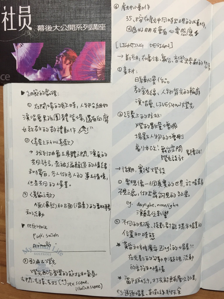 之前聽過莉莉的編劇工作坊、田調講座等等,就發覺自己對於藝術創作背後的成形過程、設計脈絡非常感興趣(我果然熱愛幕後一切XD),所以這次有新社員的燈光+音樂+動作+編劇兩場講座,偶當然不會錯過!!!(唯一小可惜是舞台設計修和沒有來嗚嗚
