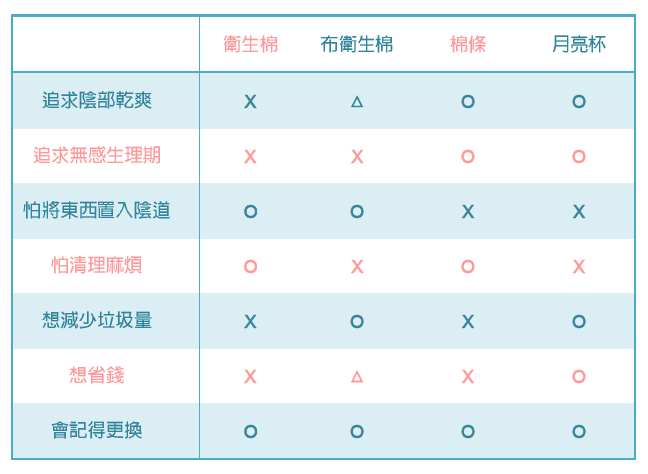 第一列,布衛生棉比塑膠衛生棉透氣,但畢竟經血還是會流出外陰部,所以不及棉條和月亮杯乾爽,給△。
