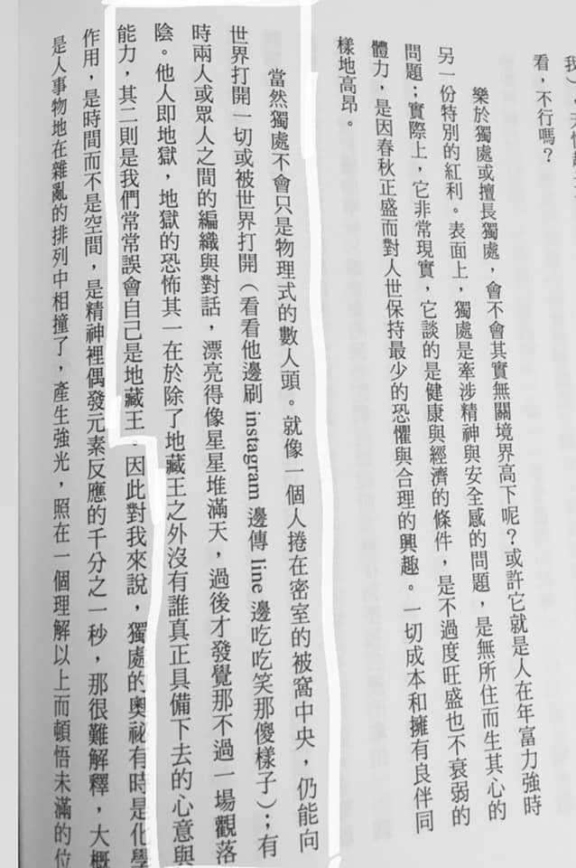 「世上沒有什麼比自顧自更舒服的事了,而所有的餡都是舒服時不小心露出來的,數千年前思想家已經提醒他的追隨者『慎其獨』,自己對自己無意袒現思想,往往令人沮喪:這一段無法超越,那一段不太清明,所以就別再說他人是地獄了,最需要普渡的根本是自己。」XDDDD