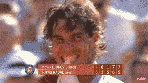 在第三盤時Rafa被抓犯規,第五盤揪扣也被罰了一分。他因為在球尚未完全形成死球之前,因擊球後站不穩而觸網了!他當時很驚訝於主審的裁罰,卻也只好乖乖服從。儘管他後來仍有局點機會,隨後卻被越來越積極的Rafa逼出破發點,Rafa成功破發後,比賽來到4-4平手。我當時想,如今這場四強戰已經變成「0-0的比賽,誰先連拿兩局就是贏家」的局面,而接著又是換Rafa發球,那他拿下比賽的機率就是大幅提升了!!!不不不……事情仍不會如此簡單就了結(抓狂),這兩隻還是一直拚,最後拚到了long game,7-7持續平手中啊啊。吼吼吼——那時候我的心臟簡直快停了!!!!!只要是Rafa的發球局我都怕得要命,深怕有任何閃失就被破發,還得轉靜音比賽才看得下去啊XDDD (緊張時刻恨極觀眾的叫喊聲啊!) 而且,都到了這個時候了,兩人都很敢打也都具備實力獲勝,Nole出現了很多次犀利的對角;Rafa則是打出了好幾記令人難以置信的可怕穿越!前幾盤、幾局情勢更是想三溫暖一樣轉來轉去,根本沒有人能保證誰會進入決賽啦。過多的變數使比賽變得又精采又弔詭,每當觀眾覺得其中一方該贏得這局時,下一秒情勢就被逆轉回來了。這也快逼死我了啦啦啦好緊張!!!!!!!!!O口Q!!! 結果,最終,Rafa還是憑藉著強大的底線防守+超快腳程+不肯放棄每一顆可能的球的精神,just as always,讓Nole在他最後一個發球局頻頻失誤出界,以9-7拿下第五盤。比賽結束,七屆冠軍再次挺進法網決賽啦!!!