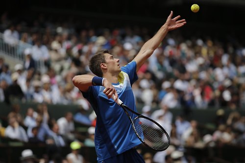 而在等待揪扣那場比賽時,因轉播剛好切到Philipp Kohlschreiber(老傢伙) v Jiri Vesely(年輕人)的比賽,想說好歹我也覺得Kohlschreiber這經驗老到的傢伙打球其實很不錯,於是就看了一下——吼吼這一看驚為天人!!!我發現我還蠻喜歡Vesely的球風欸!!!(Kohlschreiber:「妳不是要看我嗎?QQ」) 算是乾淨俐落型的,發球還不錯,左手持拍and雙反,雖然年紀輕輕可是整個人卻不會太毛毛躁躁(重點),耶好棒~~~(是在棒什麼啦) 第一盤就把老德(?)逼到tiebreak,真是太有才了這孩子XD (看到第二盤第二局轉播就切回Philippe Chatrier了。)