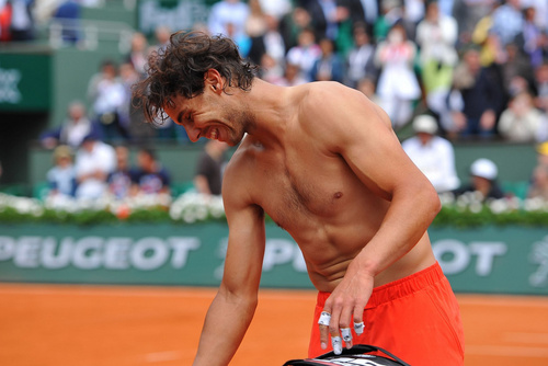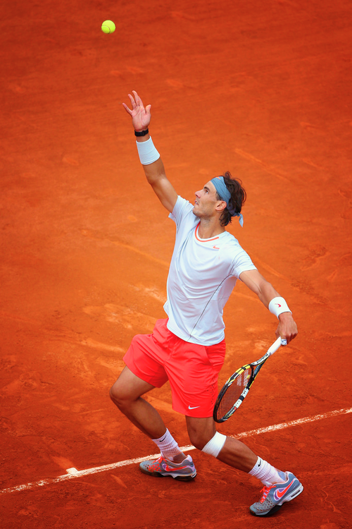 剛剛看了一下RG官網,有篇報導提及,Rafa的打法比較適合大熱天,這樣他的正拍上旋才能彈跳至肩膀高度、造成威脅;而Roger的正好相反,他大約及腰高的正拍和流暢的單反,適合冷天。此外,天候不佳的巴黎,雨常在法網賽是期間下下停停,空氣中的濕氣對Rafa的上旋實在太不利,那會使球速變慢、旋轉也不足。又打又停又延後的賽事,更會影響選手們的心態、氣勢或是熱身準備啦等等的,像Rafa籤表這邊的球員,很多也都因為延賽至隔日再打的比賽,而被迫連續兩天都得下場作戰啊!(這裡和這裡,是關於Rafa批評賽程不公平的新聞。基本上我覺得不斷延賽這點真的得好好正視,起碼有個像樣的配套或是進行彈性調整等等啊OTZ)