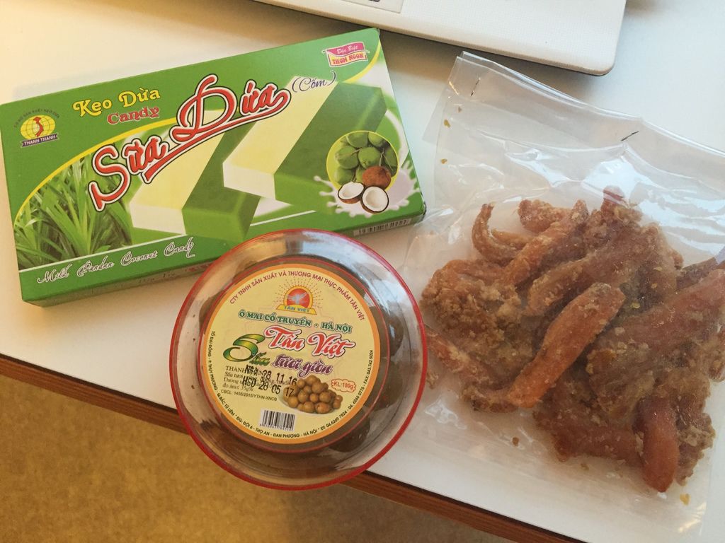 越南樓友和Phuong分別送我的一些越南零食,有蜜餞、椰子糕(超硬)和一包聞起來很像薑塊的炸物。