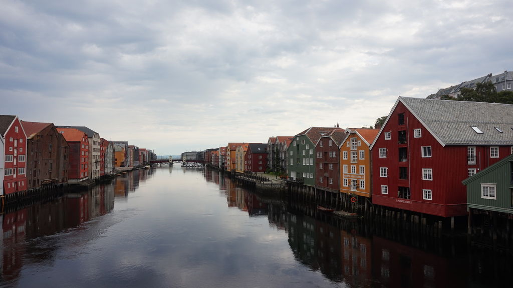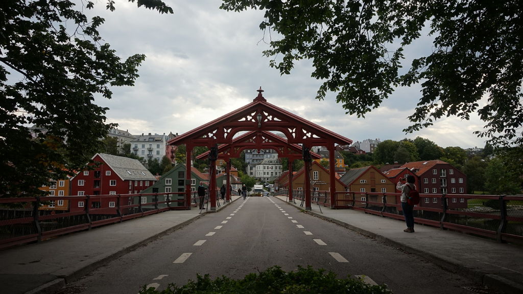 從橋上往西南方看去,是Trondheim較偏郊區的那邊;而向東北方看去,則是舊碼頭及並排繽紛的老房子。這裡以前畢竟曾是首都,因此在漁港貿易上也有曾經的繁盛。如今或許漁港的重要性不如以往,但它一留下來的古老氣息卻始終在橋上美好而迷人。