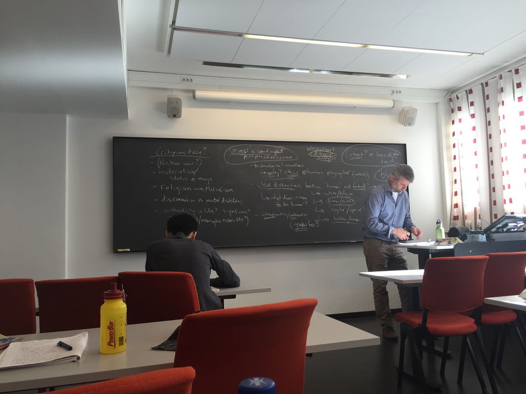 這是我這學期在UiO每周四修的「電影與小說」課的教室,照片中黑板前方站著的是我們的教授Mike,是位美國人!所以聽他以我最習慣的美式口音講課、講美式笑話,真的很舒服XD