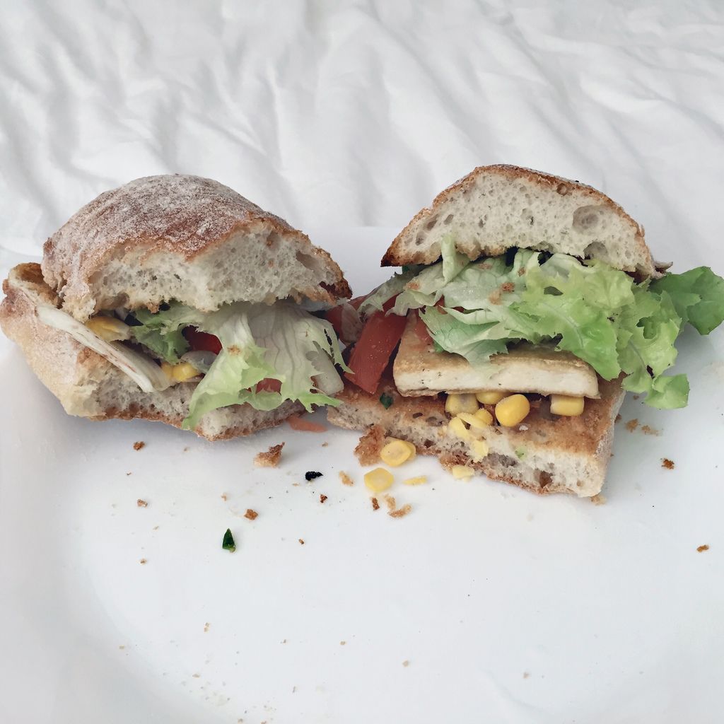 午餐吃吃巧巴達,夾煎豆腐、涼拌酸黃瓜和一堆蔬菜,清爽好吃吃。