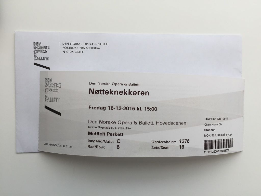 我也跟曉琪拿了之前託她買的2016聖誕節芭蕾舞劇《胡桃鉗》的票,在奧斯陸歌劇院看表演真的是在挪威相對便宜的消費了,愛看劇的人不容錯過!