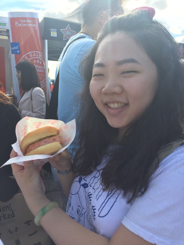 這家鮭魚攤現場賣的食物有鮭魚生魚片和鮭魚堡,都是大排長龍哇~曉琪和Yuyu就各去買了一道來嘗鮮。