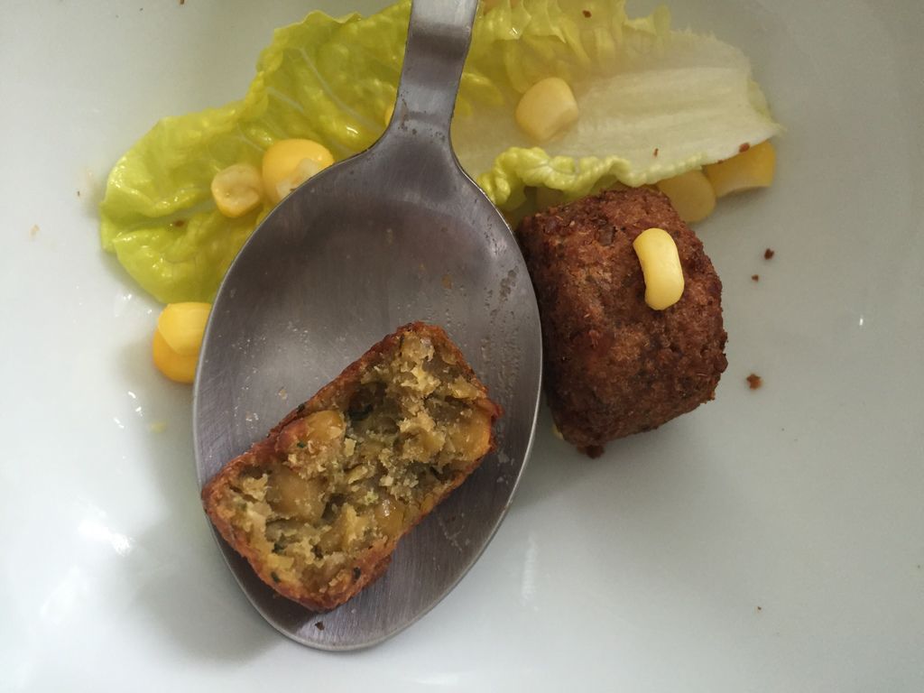 無論用烤箱烤或用平底鍋煎都很簡單方便,迷你素肉排大概是一口一個的size。裡面看得出來有玉米和一些蔬菜,口感很像豆泥和馬鈴薯泥的綜合,已經事先調味,這款是咖哩香。口味不是我的最愛,但口感很真實、不會有台灣那種素料的假假加工感,還不錯!期待之後嘗試更多口味哈哈。