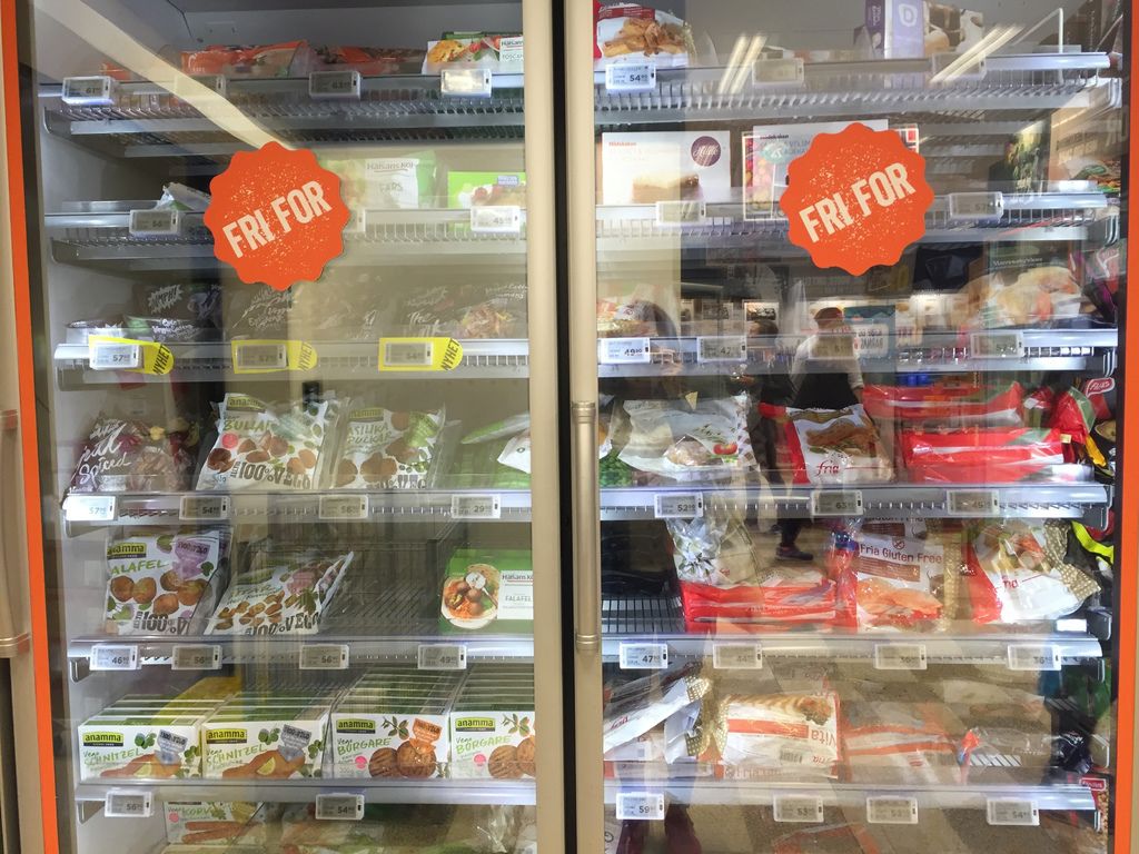 順道去了MENY看,因為印象中上次看到有個素肉品牌在這邊有上架。結果曉琪yuyu發現了一個完全屬於我的櫃子:FRI FOR區!!!(感覺意思是free for anyone,有任何特殊飲食需求的都能在這邊找到可食用的產品,包括素食者和無麩質食品攝取者。)