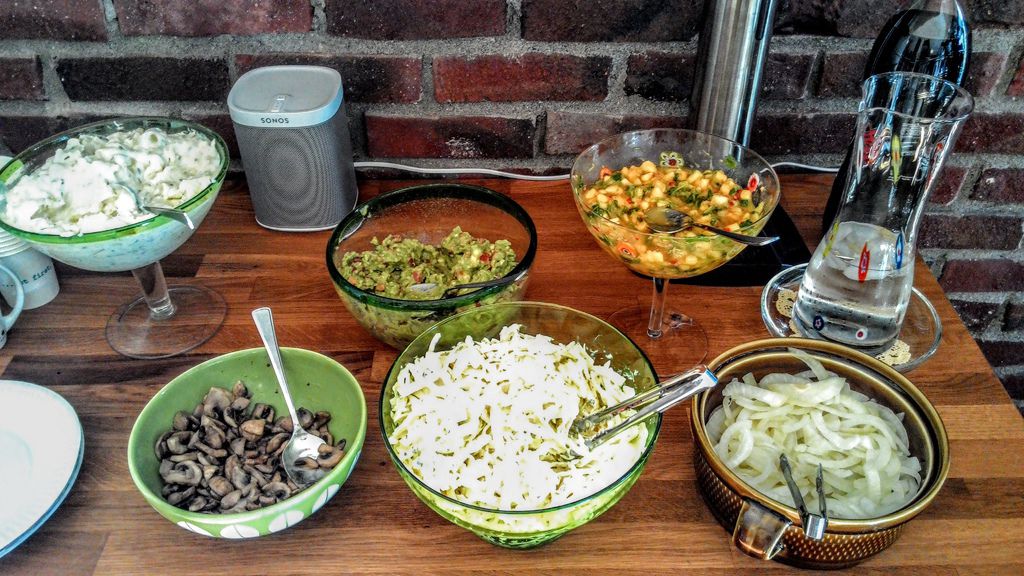 今天大家是自己帶食材來烤、一起共享。而David一家也如同上次,用心準備了開胃菜,有蘑菇、Guacamole、cabbage shreds和洋蔥玉米沙拉等等,我默默注意到都是素食,所以吃得很開心哈哈