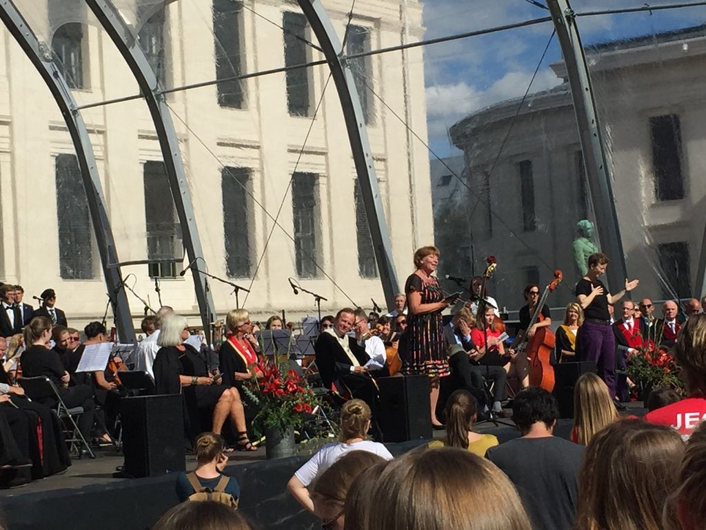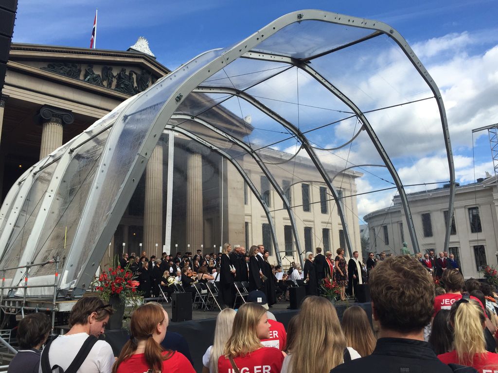 也難怪開學典禮要在這邊舉辦,因為奧斯陸大學的典禮頗為盛大。不是裝扮很華麗或名堂很多的那種,而是請來了整組樂隊和合唱團現場奏樂歌唱,校長、主任(應該吧)和市長等也都著得體穿著,全程以挪威文、偶爾夾帶英文,認真仔細的宣講,一旁甚至還有手語即席翻譯。