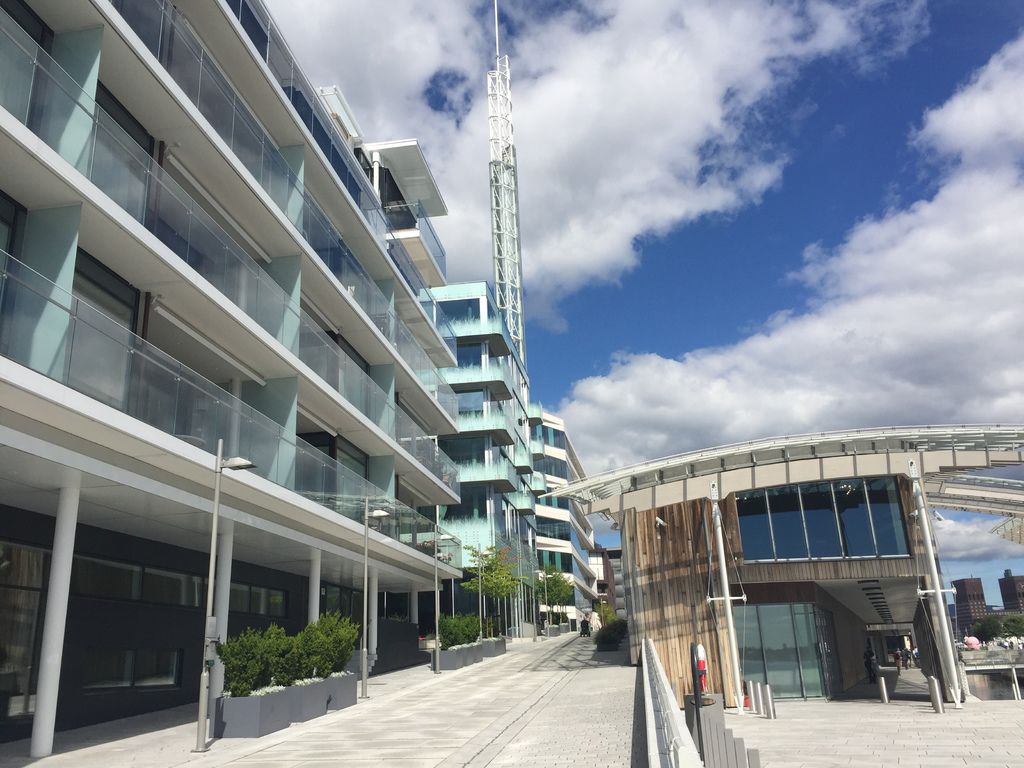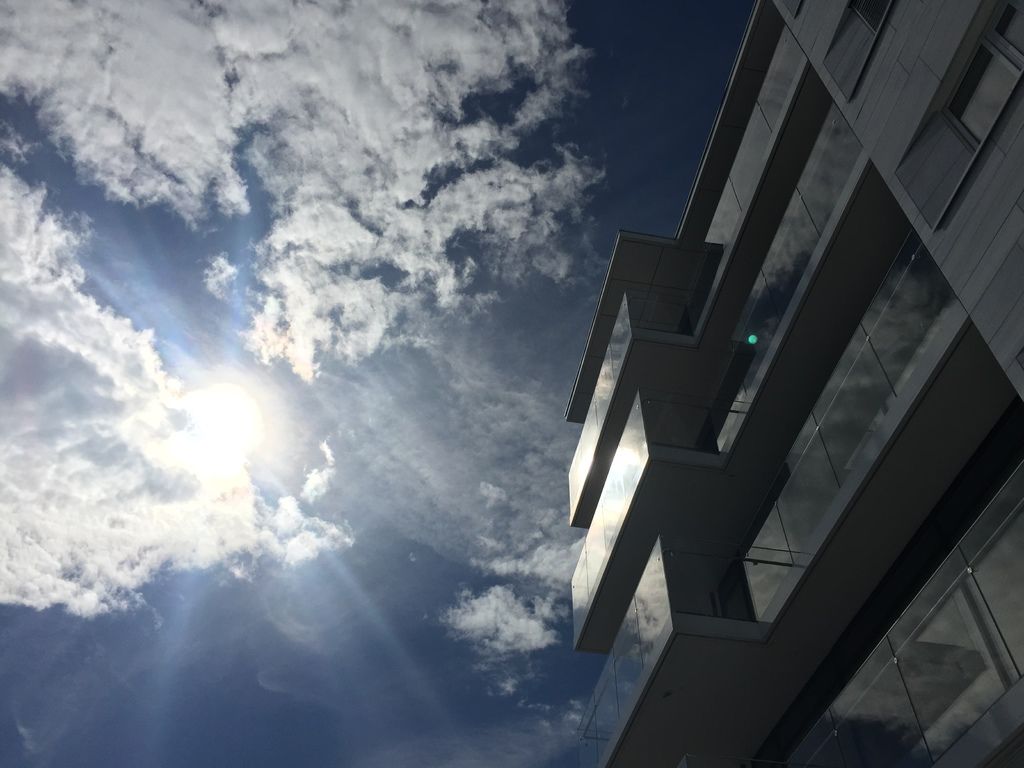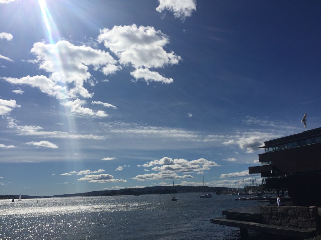 挪威建築真的很愛大面積玻璃,投影出晴朗的天空就格外漂亮。