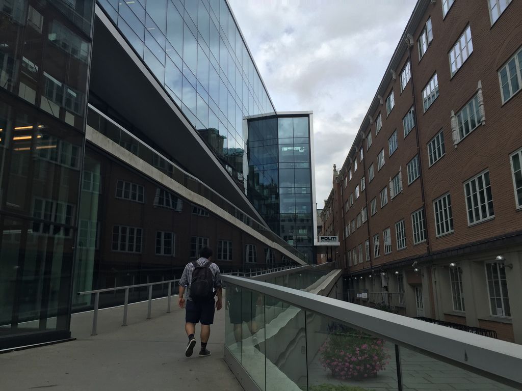 中午UiO也貼心供餐,大家聽完說明會後就一起坐在外面的長椅桌邊吃三明治、喝飲料,我也在這樣的場合和一位同桌的德國人Nina相談甚歡。她很可愛,拿出手機中朋友身上的中文刺青照,問我那些字到底是什麼意思,因為朋友都賣關子不跟她說XDD