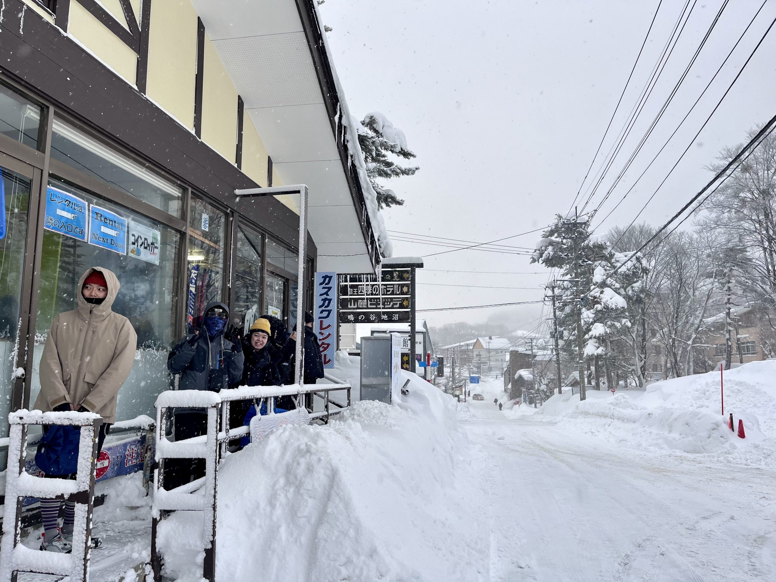 租到雪具後才是真正挑戰的開始,因為雪具店在山腳下,我們必須穿著笨重的雪鞋、扛著板,一路從山下走到上の台和教練的集合處……救命!!邊走邊懷疑人生,喘到汗流浹背,原來這就是教練們每天早上的課前熱身ㄇ……等我們走到就可以直接宣布下課了吧?(;´༎ຶД༎ຶ`)(是多累)