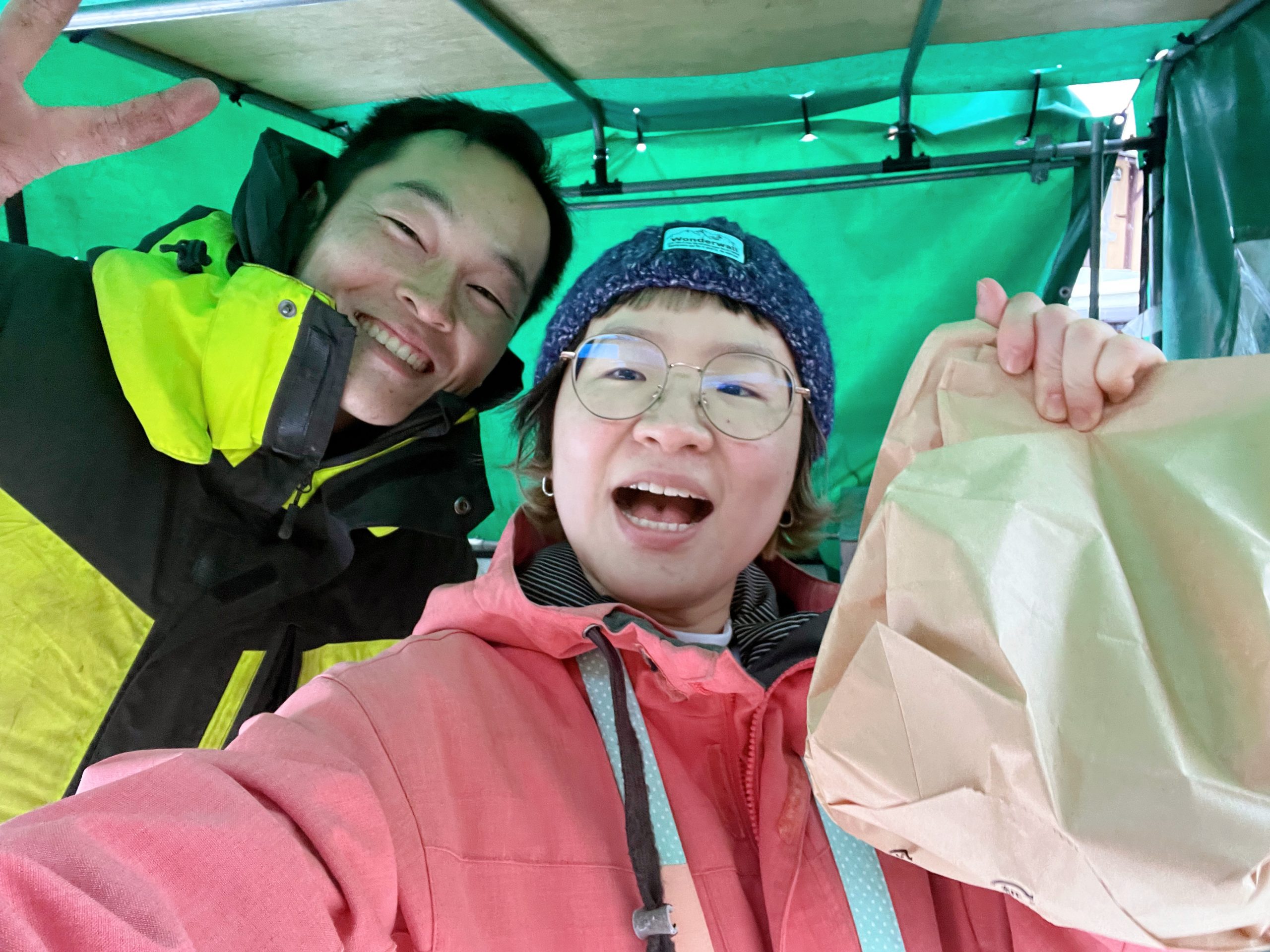 一早起床8:00AM在雪具店門口等開門,我們真的要被風雪吹成一排雪人,瑟瑟發抖中 ☃
