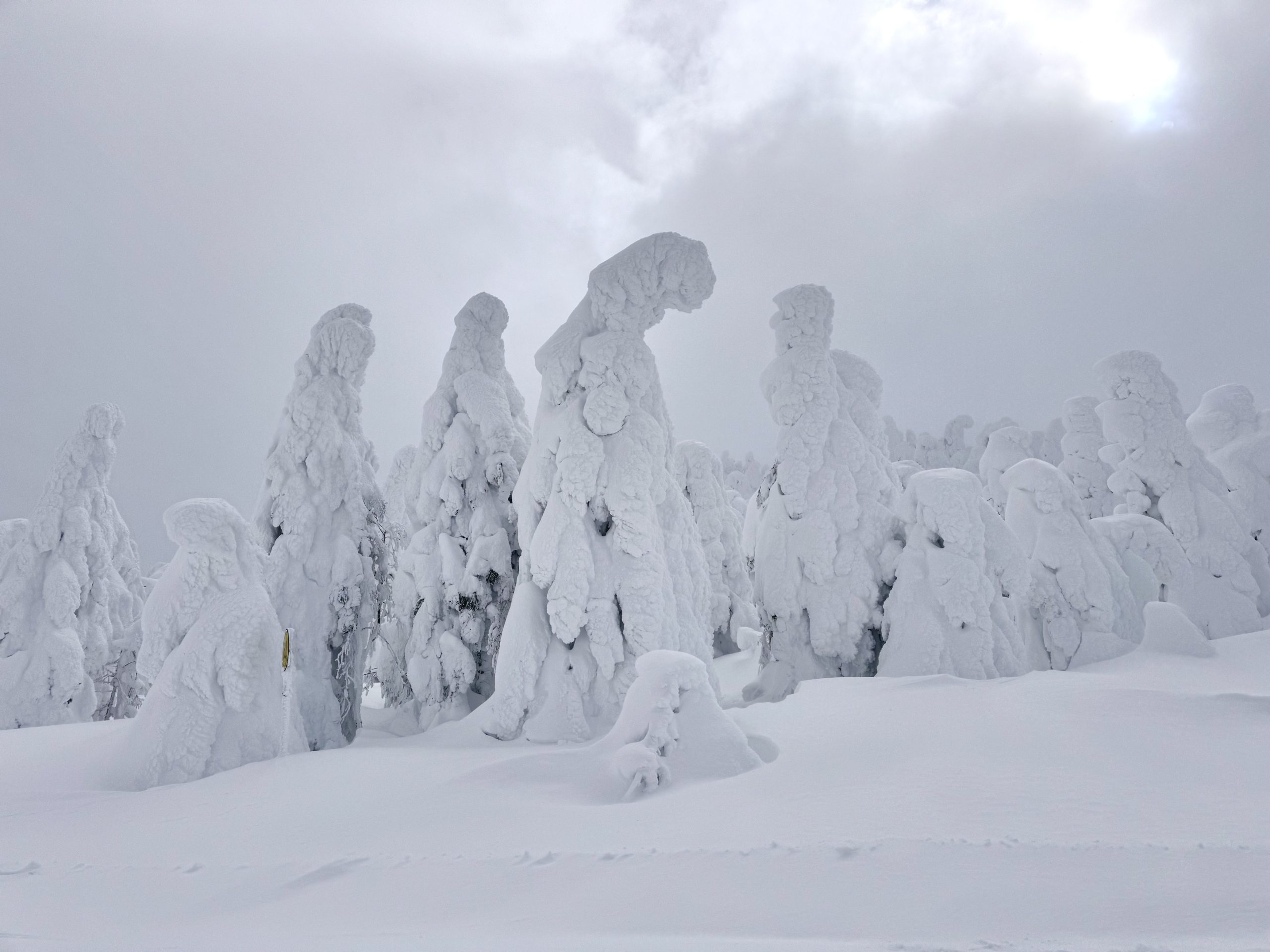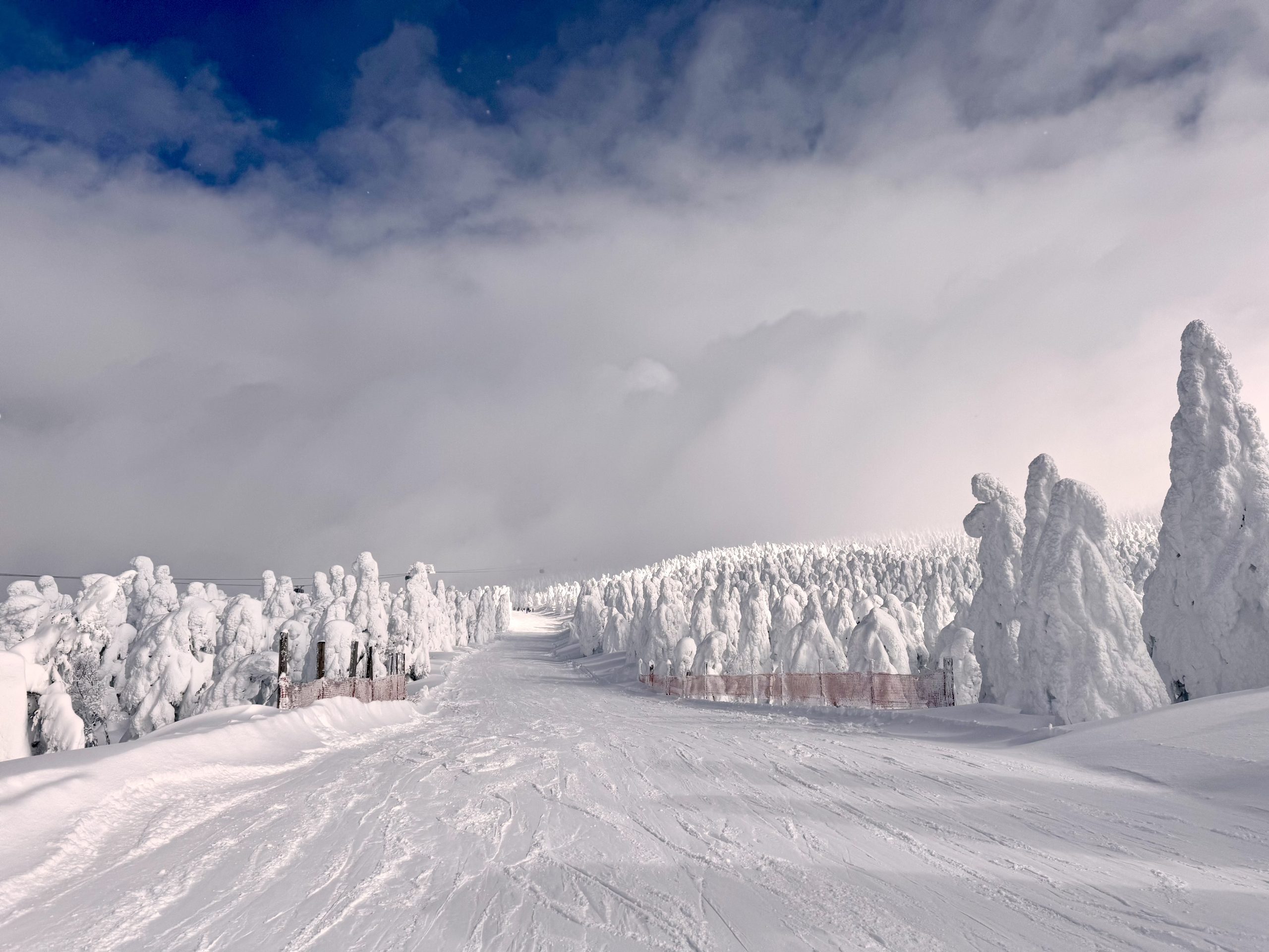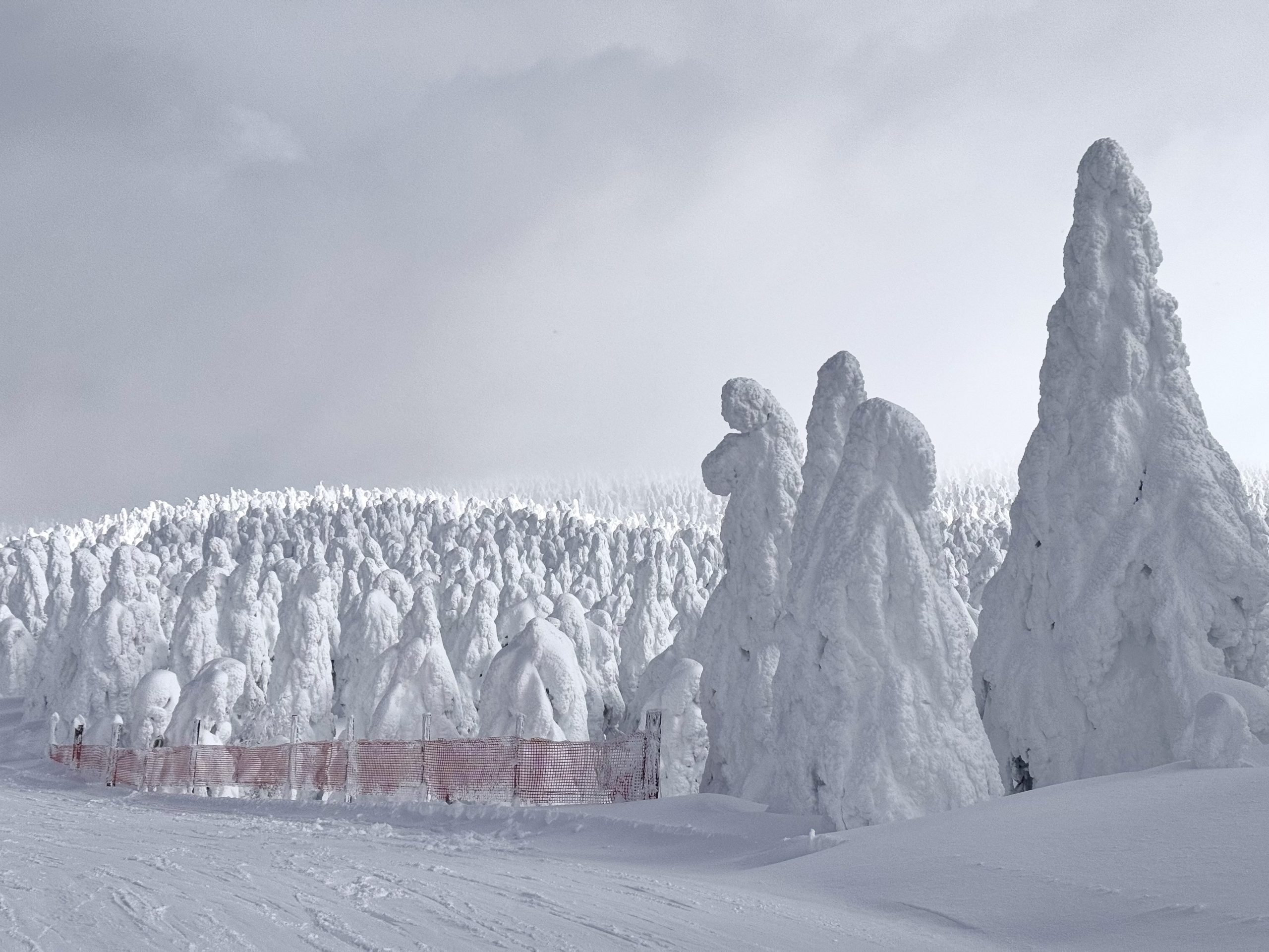 雖然在這一段我依然跌跌撞撞,還讓夥伴們等了我一陣子金拍寫(heelside又站不起來,想脫板binding strap還卡住打不開 ಥ_ಥ),但記得去年許下要回來滑樹冰道的心願,今年終於實現哩,好開心!乘坐lift時、滑在雪道上時,看著這些被白雪包裹成奇形怪狀的樹冰,像張牙舞爪的怪獸,又像莊嚴宏偉的聖母像,實在震撼又感動。
